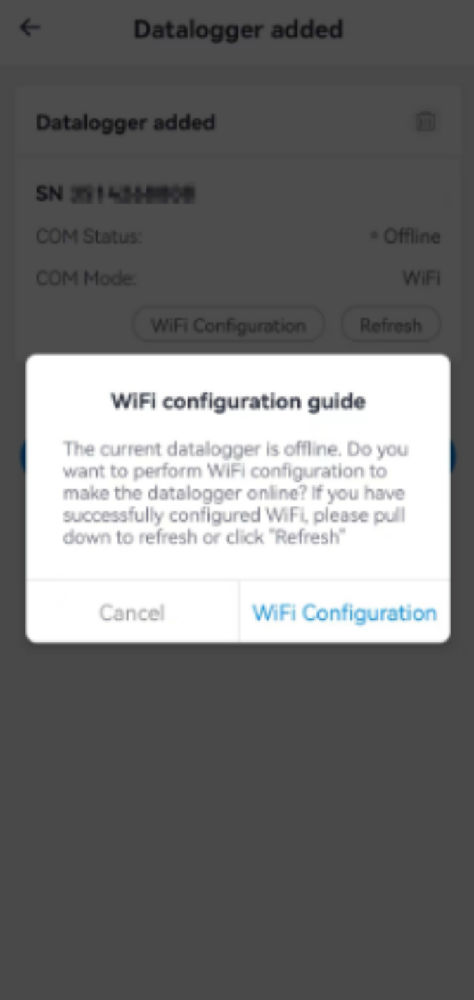 After completing the datalogger SN access, if the current datalogger is offline, you can choose to perform WiFi configuration to make the datalogger online. If you have successfully configured WiFi, please pull down to refresh or click “Refresh Status".