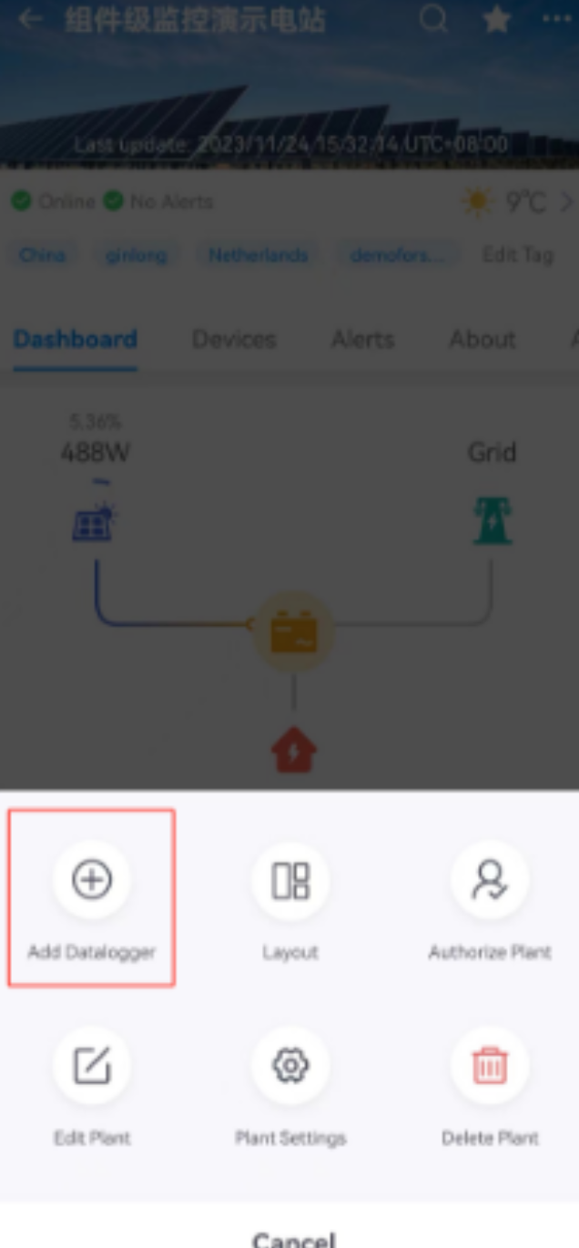 First, you need to select the corresponding plant data to add the datalogger device in the plant list, then click to enter the plant details interface, and click the“More”option in the upper right corner of the details interface again to display the function entrance of【Add Datalogger】.