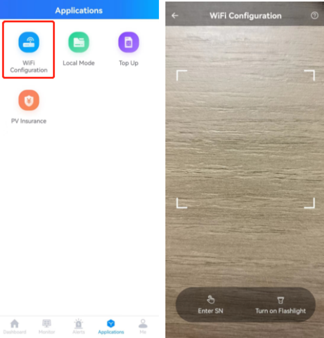 If you are adding a WiFi date logger, you need to configure networking. Please select【WiFi Configuration】in the application to operate after adding. After clicking the【WiFi Configuration】application, it will jump to the corresponding page, which can support automatic scanning image recognition or manual input of serial number and other functional operations, so as to complete WiFi Configuration according to prompts, as shown in the figure: