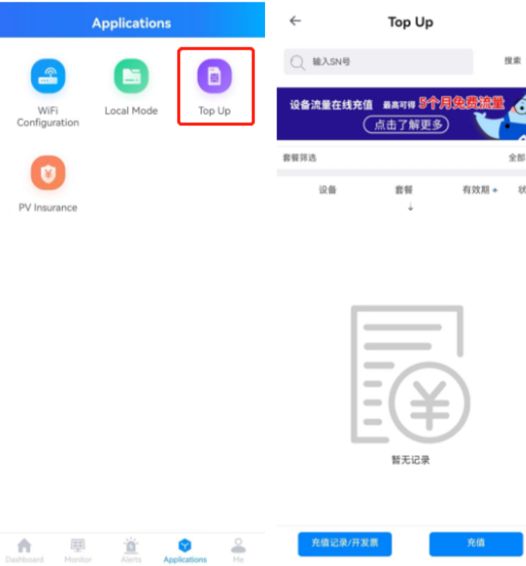 The Top Up application is a function operation and data record that provides a third-party online service to recharge the SIM card of the date logger device of your photovoltaic plant. If your SOLARMAN date logger is a GPRS module device and has been in an abnormal working state for a long time, it may be due to the arrears of the built-in IoT card. When this happens, you can go to the【Top Up】in the application section to recharge the IoT network card online. After the recharge, your device can resume normal use, as shown in the figure: