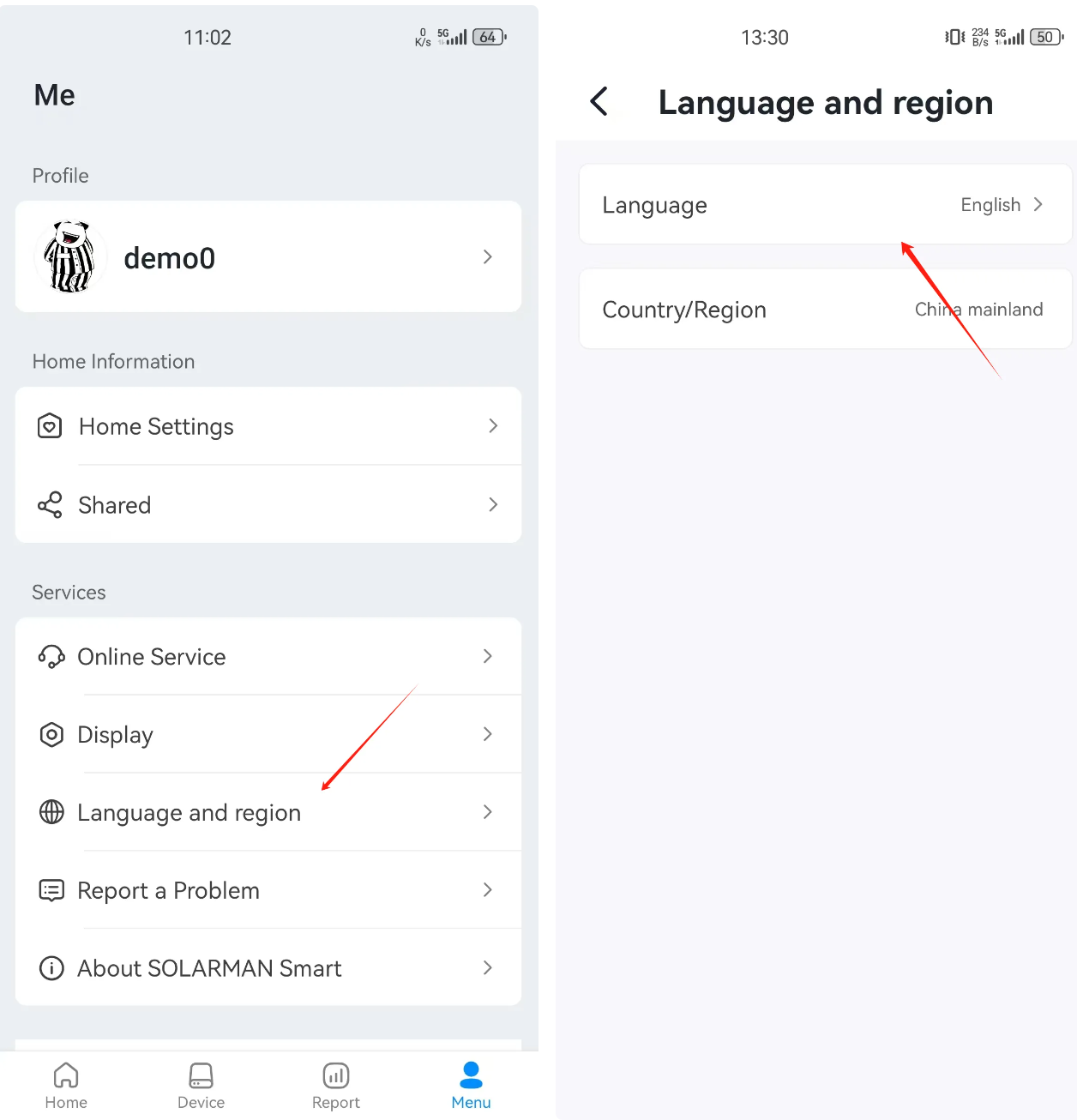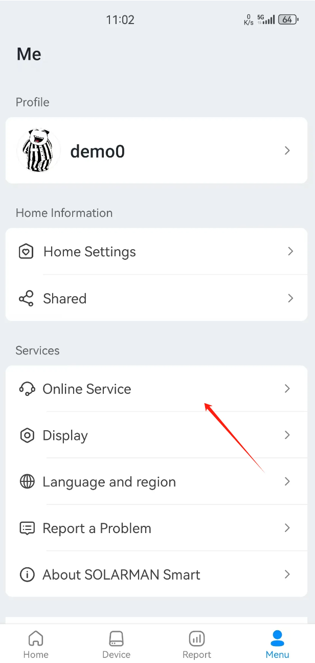 Go to「Menu」-「Online Service」to contact SOLARMAN customer service directly.