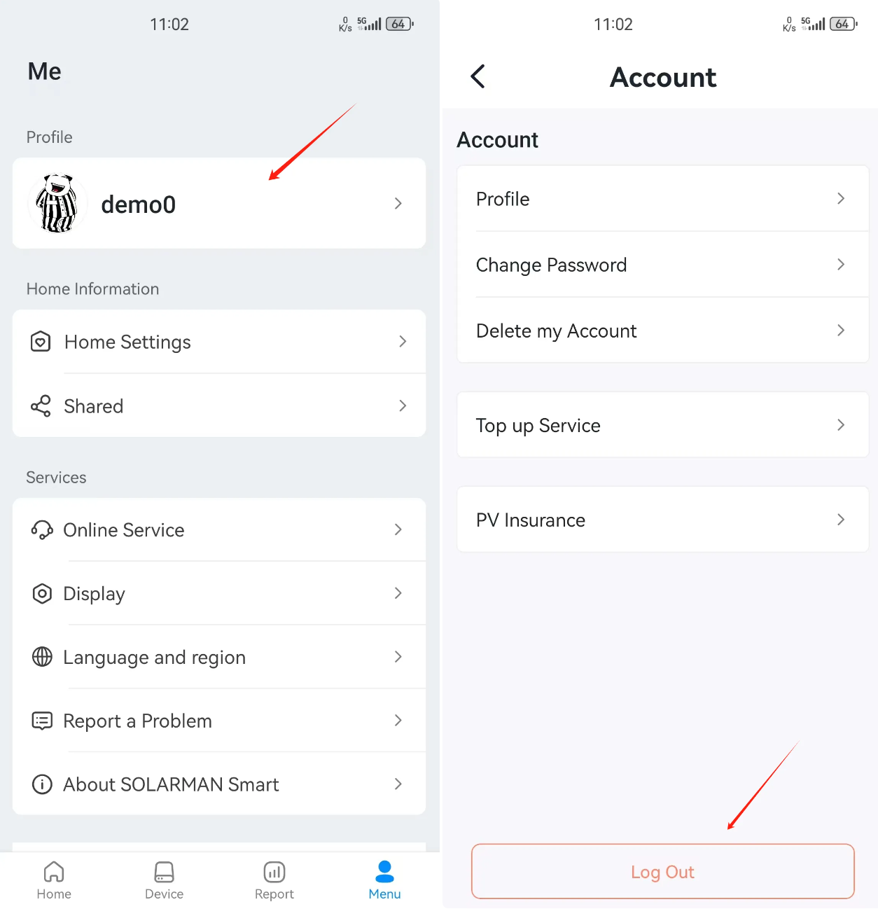 Go to「Menu」-「Profile」 to log out.