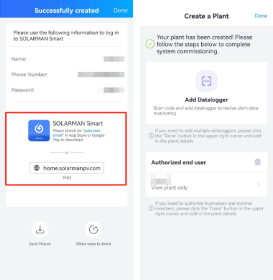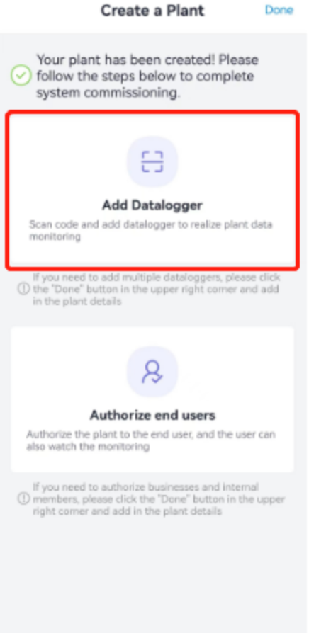 After the user is successfully created, it will be automatically added to the authorized end user list, click the【Done】button to return to the power plant creation success page, and finally click【Done】in the upper right corner to complete all the above configurations.