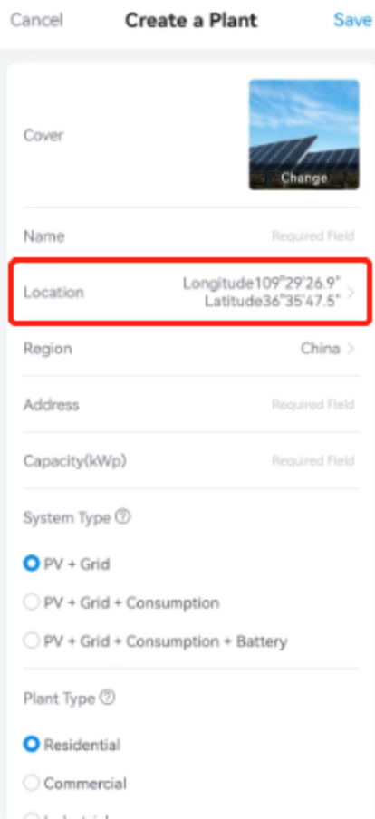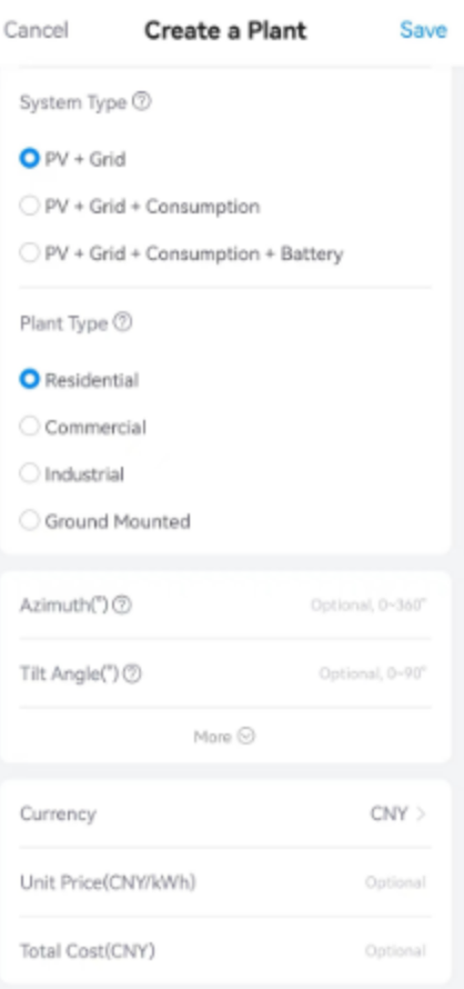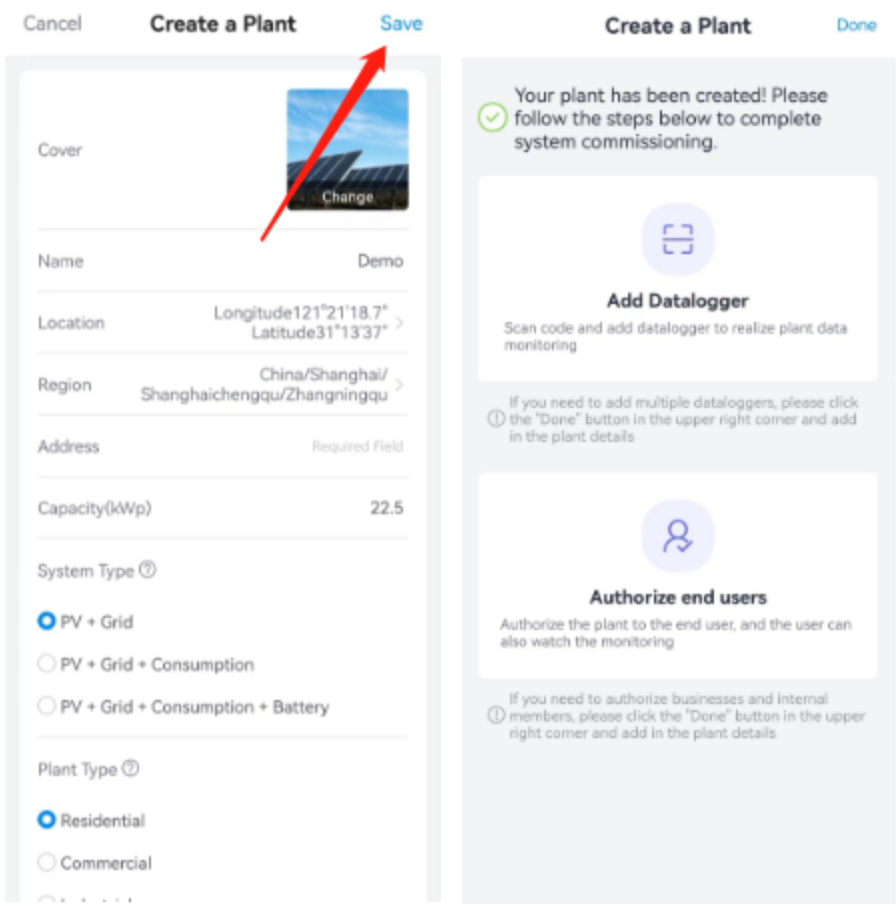 Nota: SOLARMAN Business will display plant layout according to System Type, and analyze plant data according to Capacity, please enter the fields correctly.