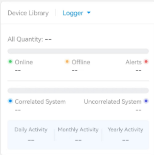 - Filter by device type: Click the device type option box in the upper right corner of the dashboard, and the system defaults to the "Logger" device type for data summary display. The device types include Logger, inverter, meter, battery, component, and combiner box. You can switch according to your needs View the corresponding device status data overview for the corresponding type