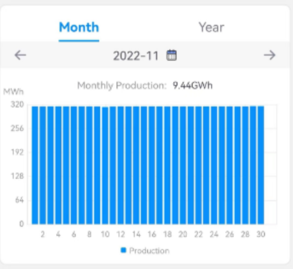 Historical Production is based on the historical data of power generation of the plant in the current month or year. It is displayed in the form of data charts for you to quickly understand. It supports viewing specific historical records of power generation data by filtering the date of the month/year.