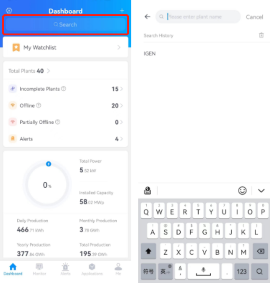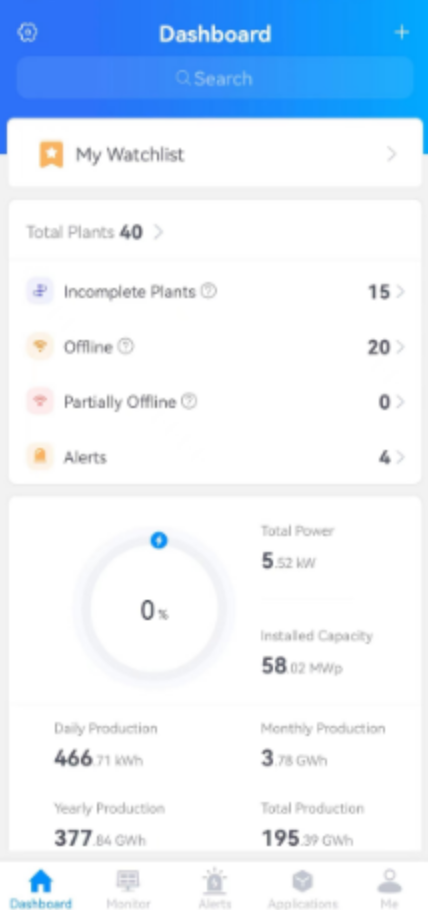 Dashboard——According to the type of login account or associated merchants, it summarizes the relevant data in the monitoring and maintenance process of the corresponding plant. It can support selecting “My Watchlist" or “Status Differentiation" to view the relevant plant data dashboards. You can also filter and view the corresponding plant by date Data variables, in order to facilitate your quick understanding and use of data charts and ranking statistics, to meet your overall monitoring and analysis of power plants.