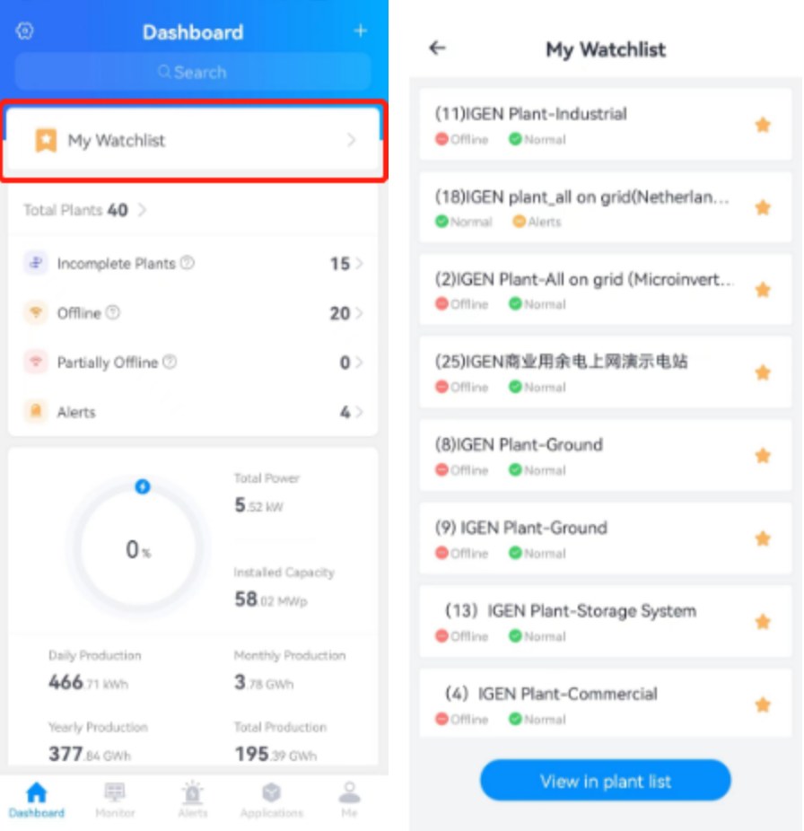 My Watchlist: Select and click【My Watchlist】to jump to the “My Watchlist" page, which supports quick viewing of the information of the plant selected for attention in the plant list, as shown in the figure: