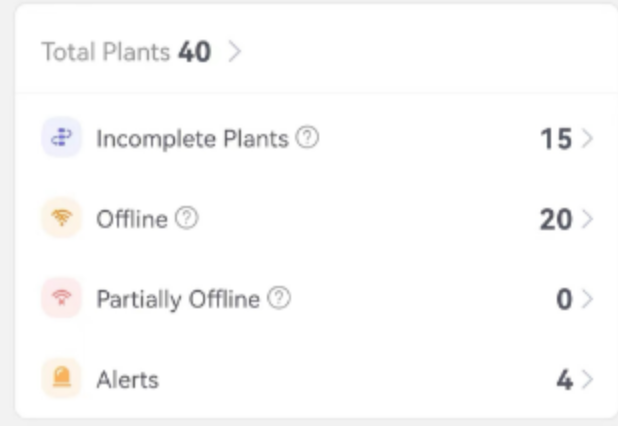 Plant Status includes the status differentiation and quantity display of Total Plants, Incomplete Plants, Offline Plants, Partially Offline Plants, Plants with Alerts, etc. It can automatically filter the list of power plants in the corresponding status after clicking.
