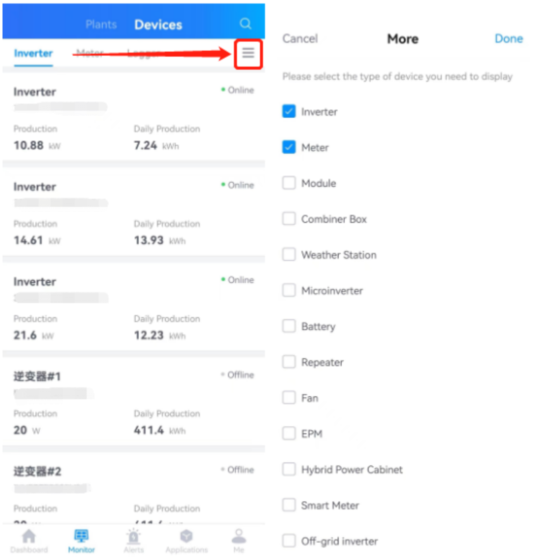 Custom Type: The system will preset three types, namely Inverter, Meter and Logger, to facilitate switching and viewing the corresponding device data information. If you want to add other device types, you can select【More】 in the upper right corner to jump to more pages. You can select the corresponding device type as required to complete the addition, as shown in the figure: