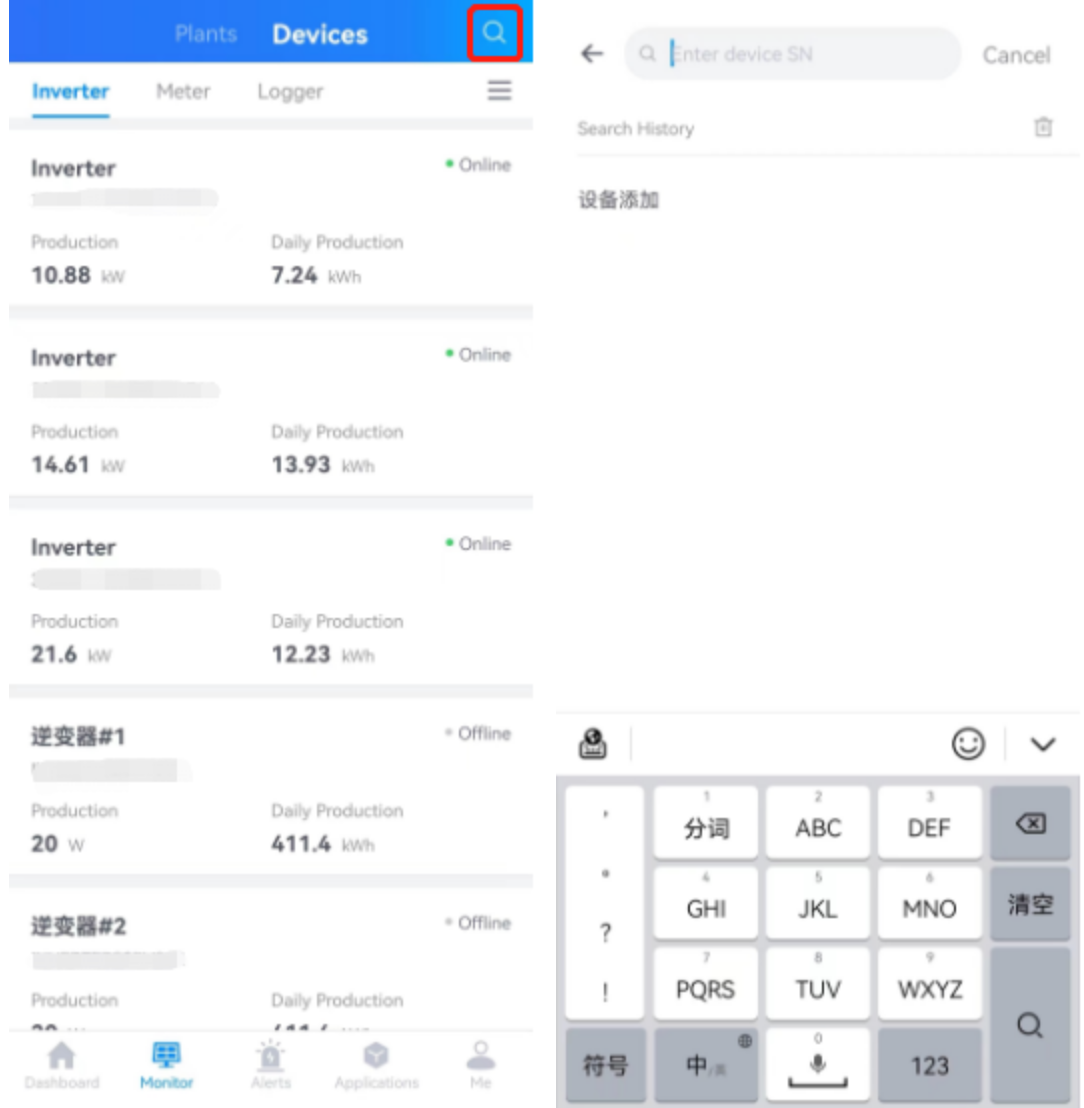 Search device: Select the【Search】icon at the upper right corner, and enter the SN number of the device to query the device data. The system will conduct a fuzzy query based on the SN number of the device you entered to quickly obtain the corresponding device data information, or search quickly through the history, as shown in the figure: