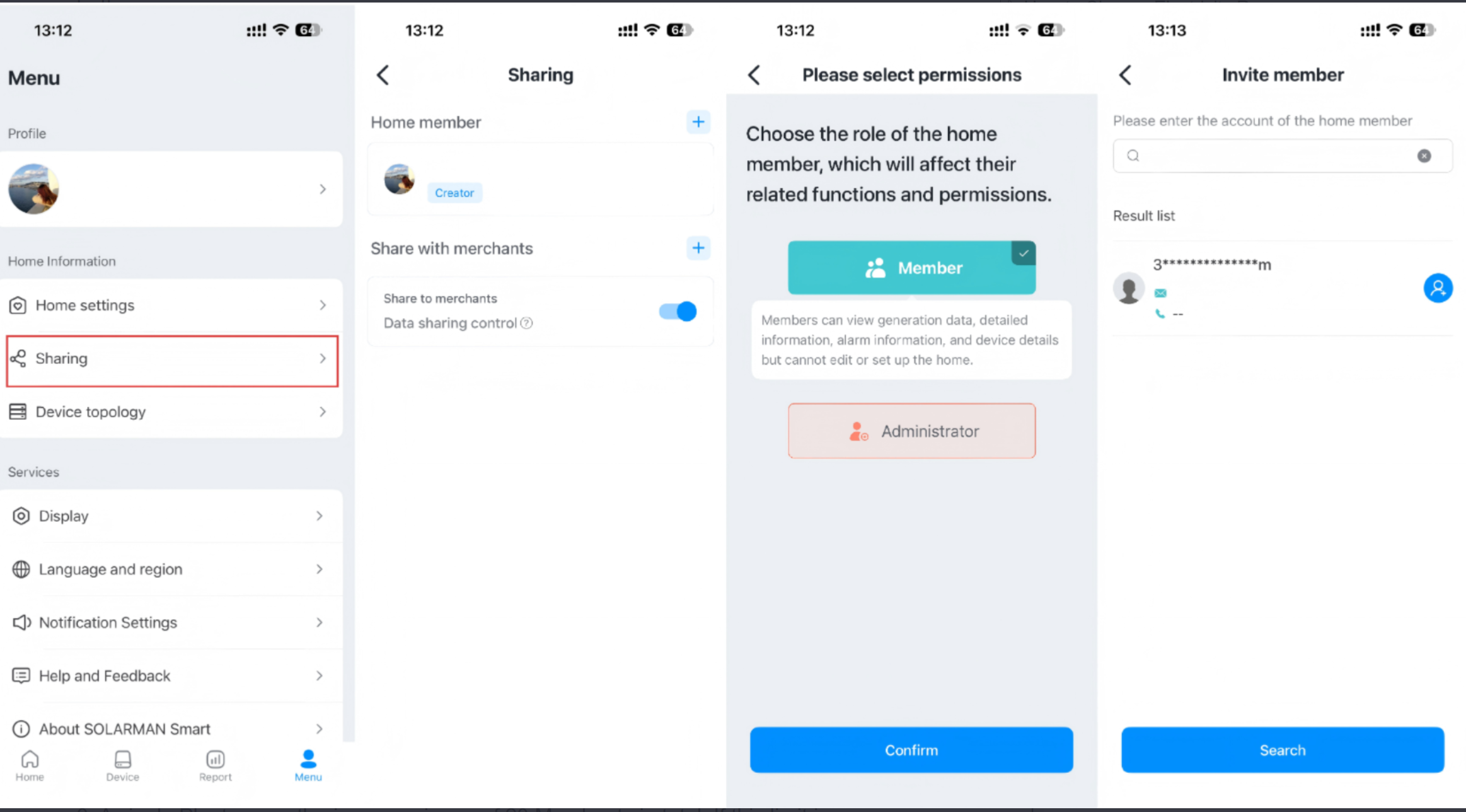 1. After logging into your account, click the “Menu” section.2. Click “Share”.3. Select the role to authorize.4. When sharing, you can choose Standard Member Permissions, which allow viewing plants but not making any modifications.5. Alternatively, select Super Administrator Permissions, which allow editing power plants but not deleting them. After confirming the permissions, click “Confirm”.6. Enter the account to authorize and search. After confirming the account, click the Add button.7. Authorization is complete after clicking Add.