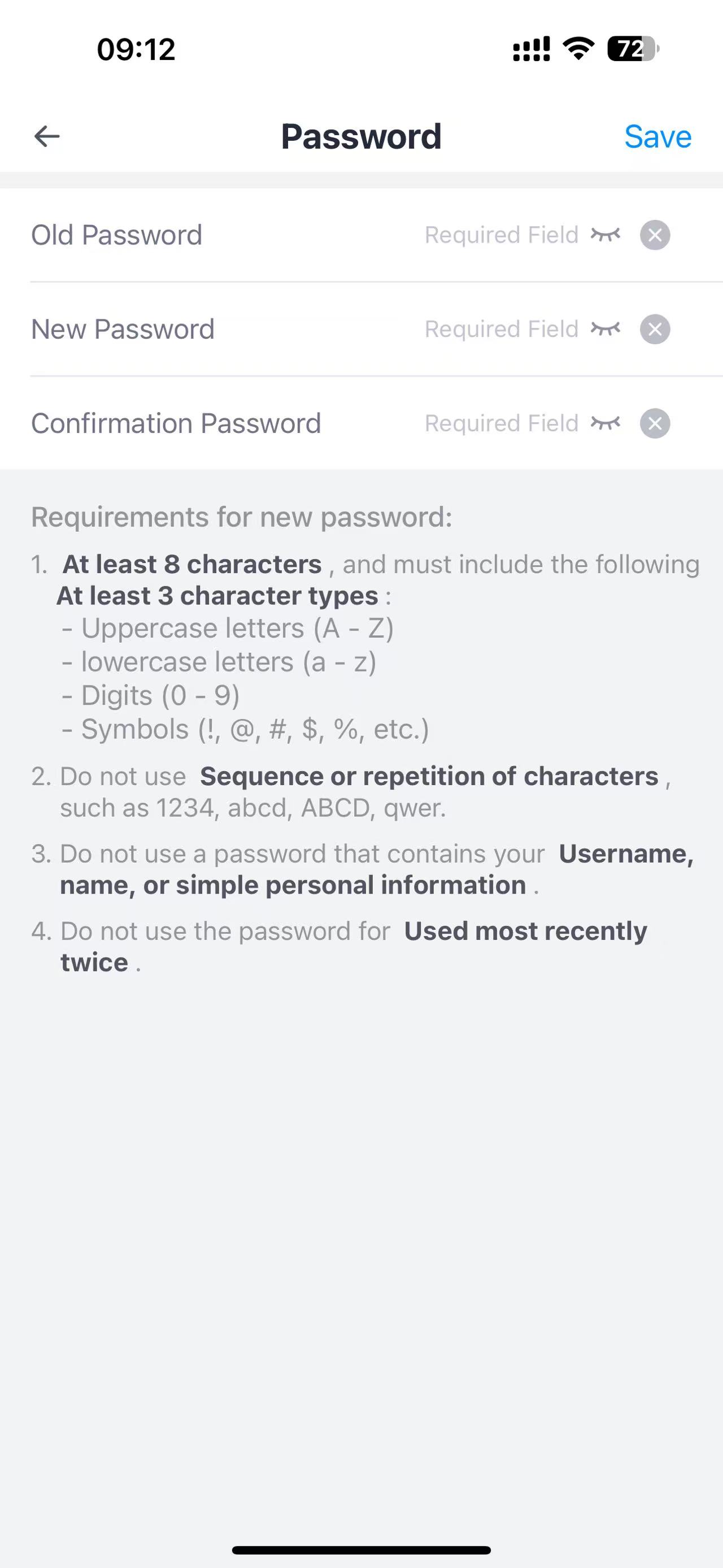 Please confirm if your entered password meets the requirements: Requirements for the new password: 1. At least 8 characters and must include the followingAt least 3 types of characters -Uppercase letters(A-Z)-lowercase letters(a-z) - Digit (0- 9) ...