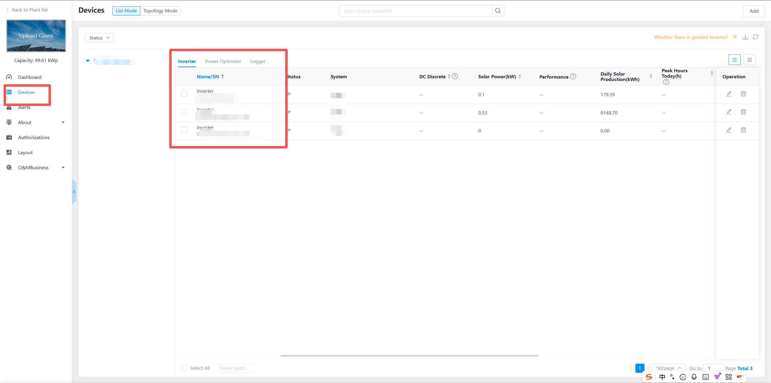 Add Logger【SOLARMAN Business Web】 1. In Monitoring > Plants, Click the plant where you want to add a logger 2. Click Add > Add New Gateway/Logger in the upper-right corner of the plant 3. Click Add > Enter the logger's SN to complete the additio ...