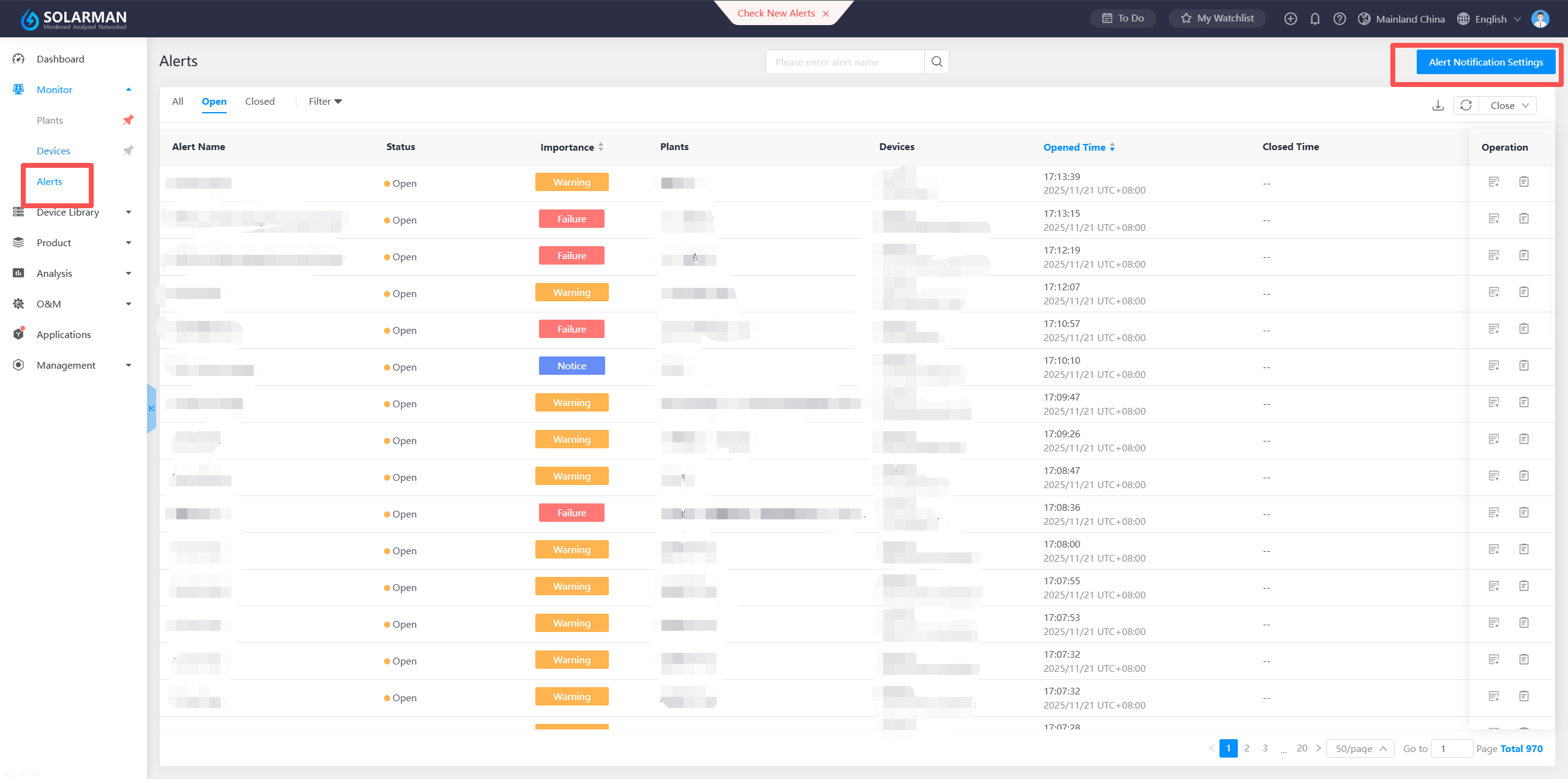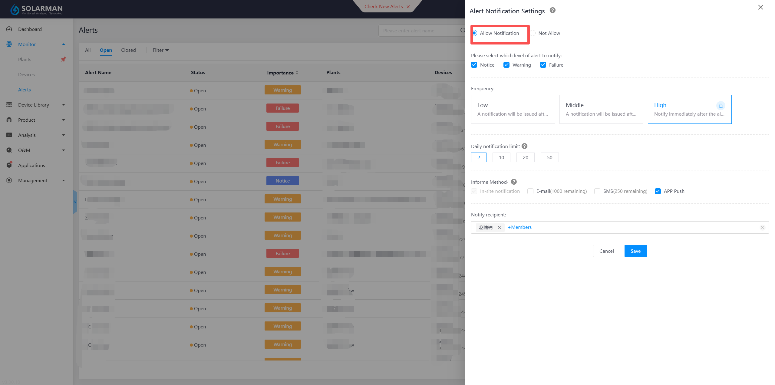 Alarm notifications are currently issued based on your configured alarm notification settings within the system. For specific details, please refer to 'Alarm Frequency' and 'Daily Notification Limit' under 'Alarm Notification Settings' in the Function Overview. Once the Plant Device alarm has been addressed, the system will cease sending notifications after the 'Recovery Time' is updated. Should you need to view alarm details during a period when notifications are not being sent, please refer to 'Alarm Details' in the Function Overview for specific instructions.