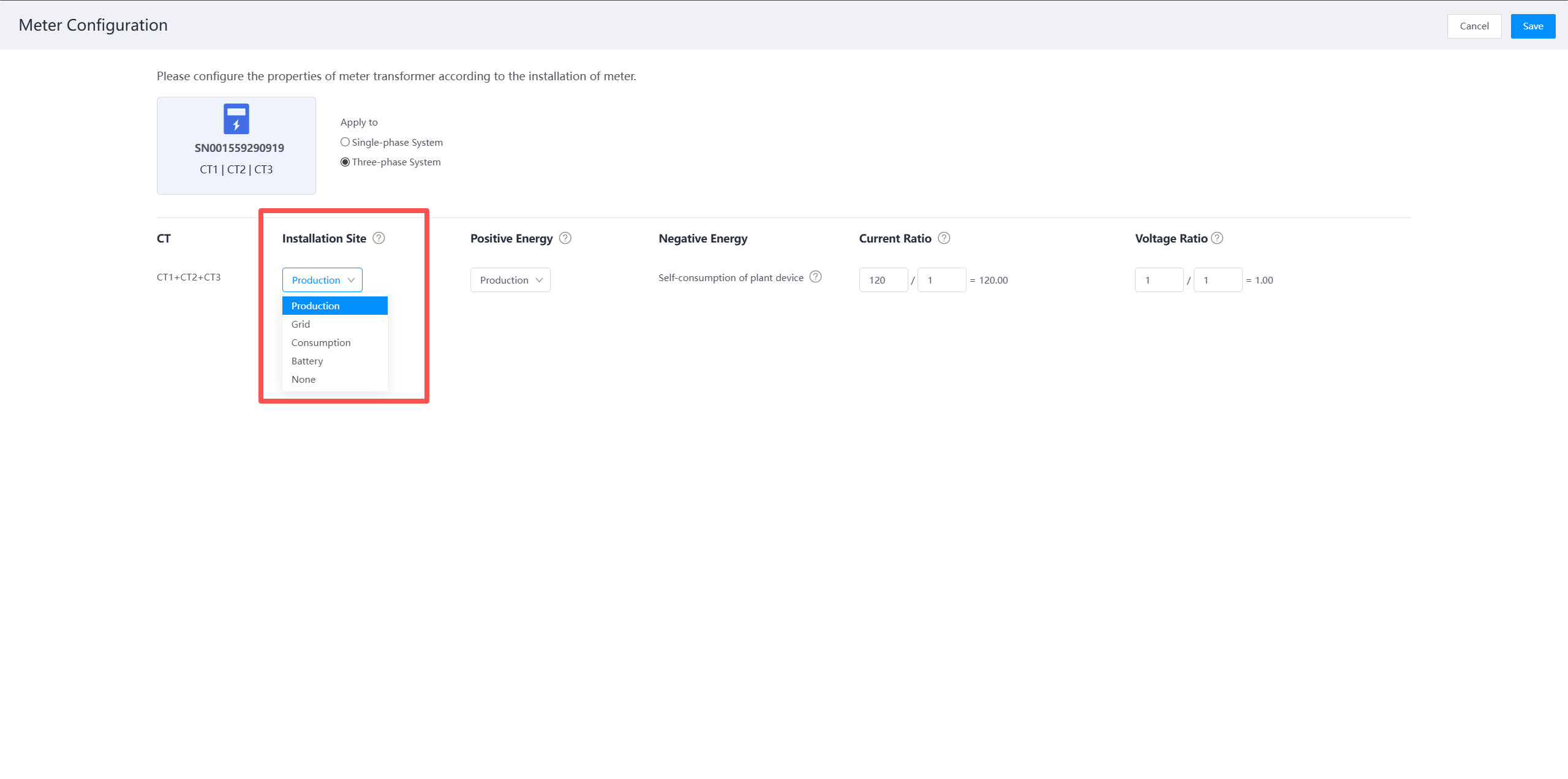 Please confirm your Electricity Meter's installation location. If it is a boundary meter, select 'Grid' as the installation location. If it is a grid-connected cabinet Electricity Meter, select 'production'. The current ratio should be entered based on the Electricity Meter transformer information. The voltage ratio is not applicable for non-high-voltage projects.