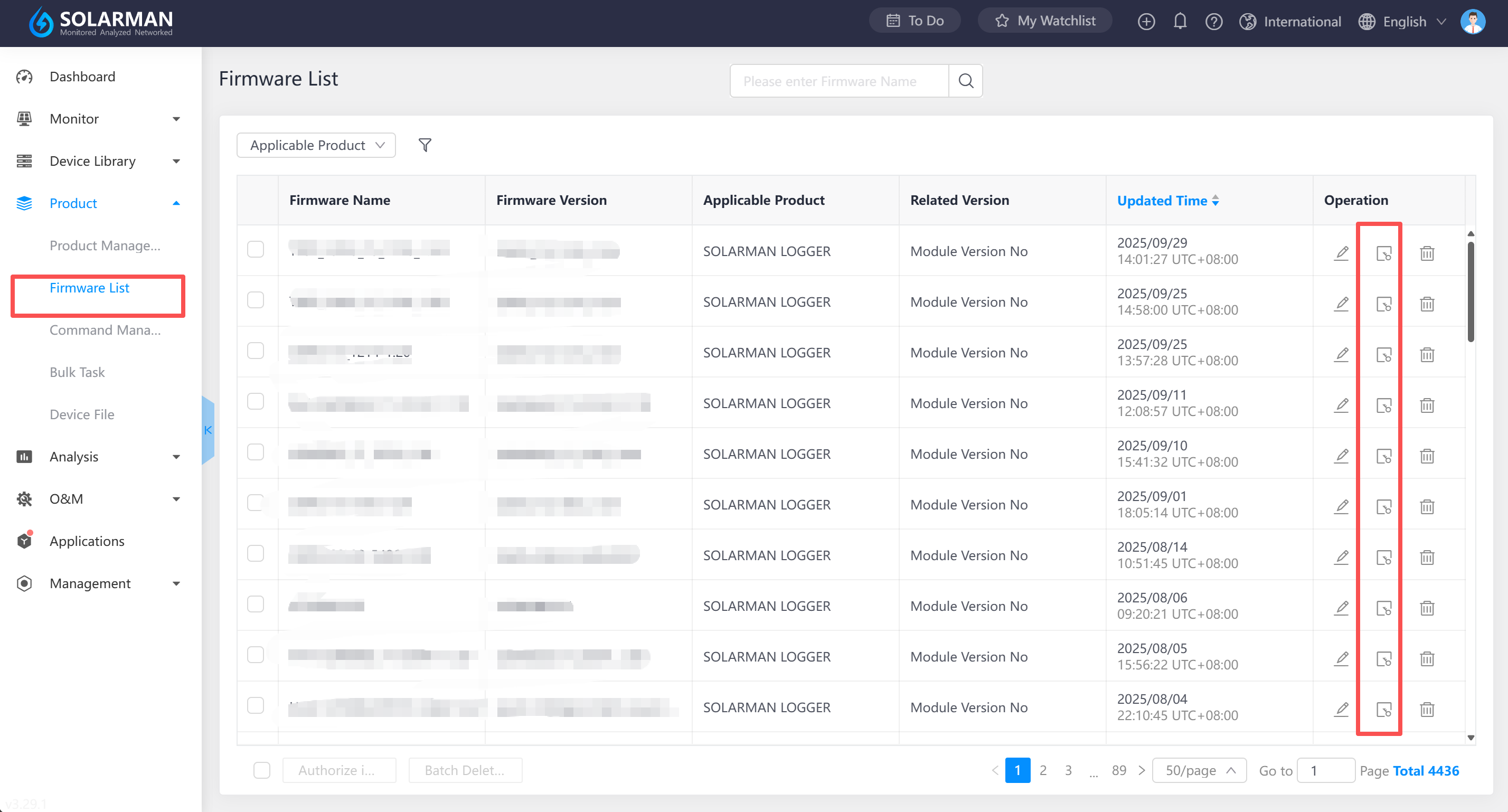 Scenario Description When the inverter, energy storage battery and other device need to update the internal firmware version of the machine, the "Firmware Upgrade" function can be used to remotely issue firmware files from the cloud to upgrade the ...