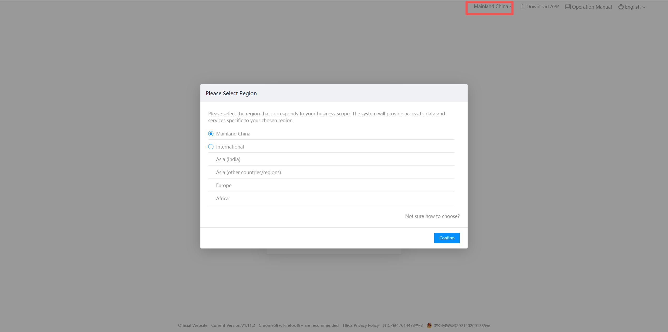 Please confirm that the correct Data Centre is selected for login. This can be verified on the Login Interface. Overseas customers should select 'International', while customers in Mainland China should select 'Mainland China'.