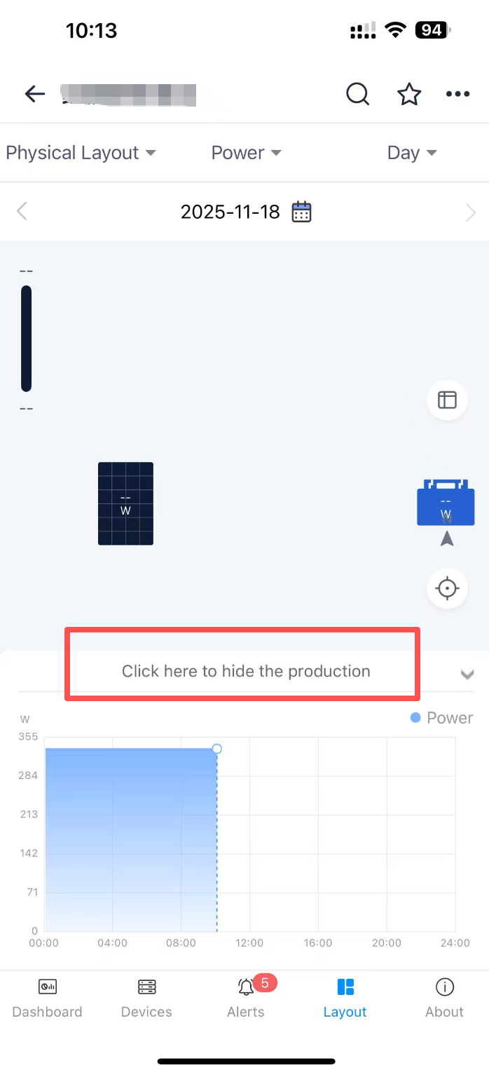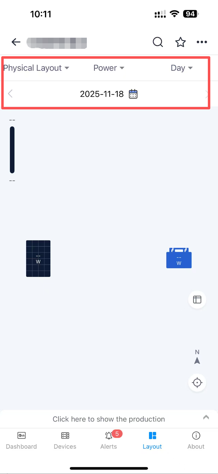 You can view the power generation status of the plant on the lower side of the system layout interface. You can choose to“Click here to show the production”to display the trend chart of the power generation power of the plant on that day, so as to understand the power generation status more intuitively.