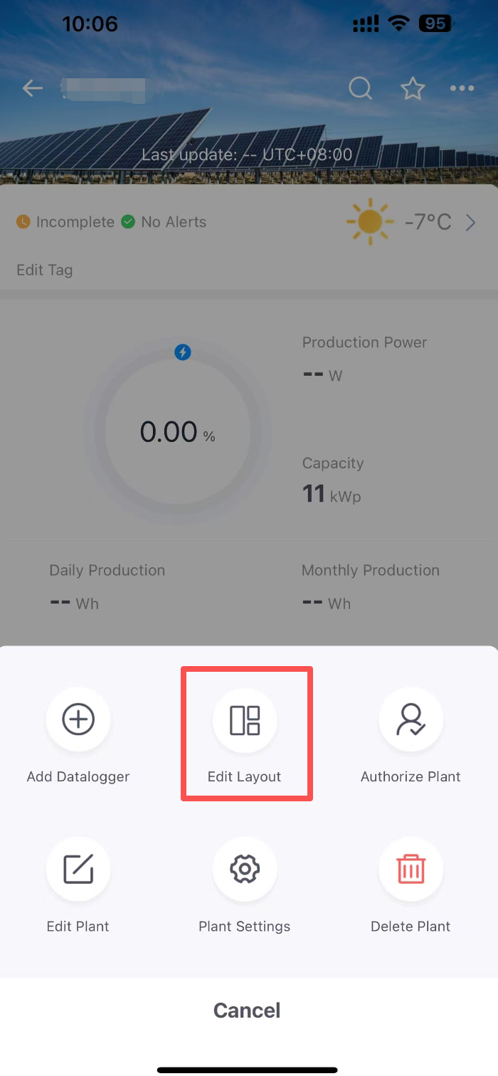 First, you need to view the corresponding plant data of the system layout in the plant list, then click to enter the plant details interface, and click the 【More】 option in the upper right corner of the details interface again to display the function entrance of【 Layout】.