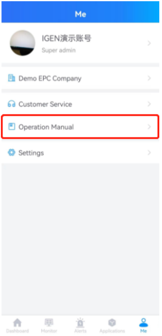 If you use the SOLARMAN Business APP for the first time, you can click【Operation Manual】to view the operation instructions for each function, so as to quickly improve your understanding of the APP application and skilled operation, as shown in the figure: