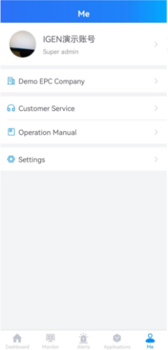The【Me】section is mainly used to manage the personal information, merchant information and basic settings of the login account. You can view the current APP application login account information, or support the selection of my customer service, operation manual, settings and other related functions to facilitate your experience of related operations.