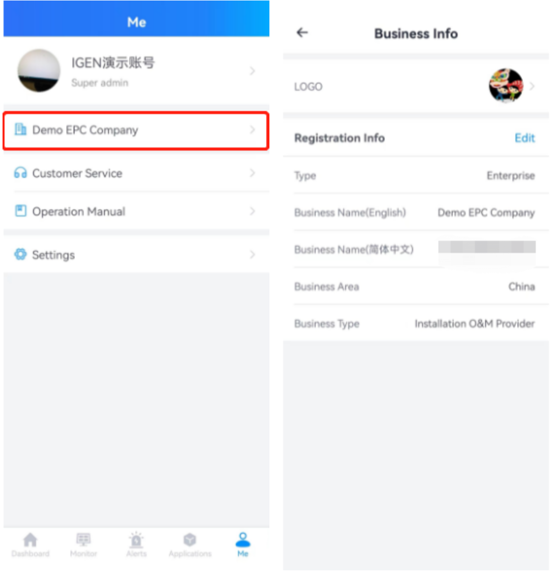 When users need to modify their personal information or basic settings when using SOLARMAN Business APP, they can view and adjust their account information through the "Me" section. If they have doubts about the use of the APP, they can choose my customer service to give feedback or view the operation manual to learn about the relevant function operation instructions, so as to meet the application in different scenarios.