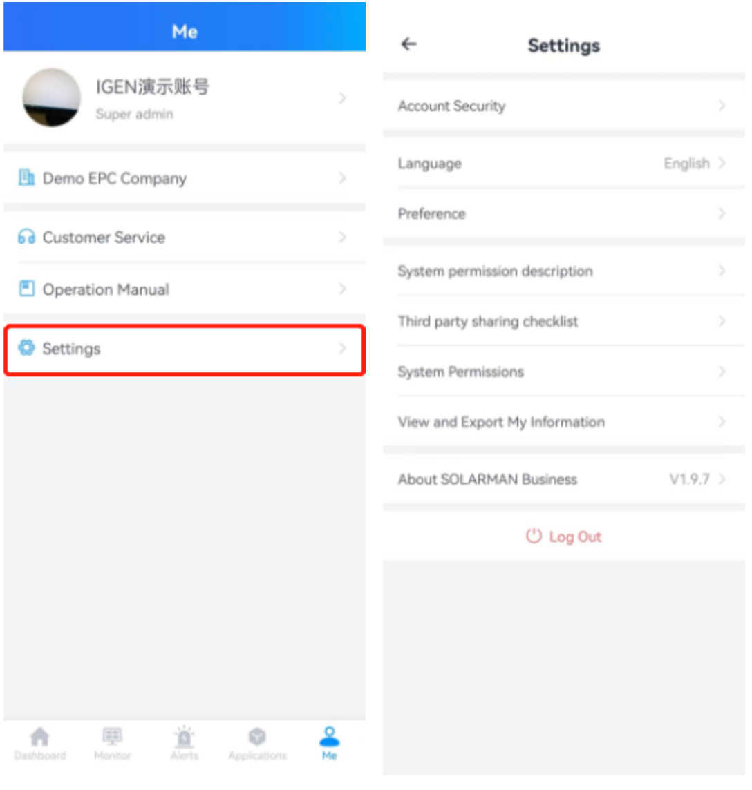 When the user needs to view and manage the basic settings, he can click【Settings】to jump to the corresponding page, which can support viewing account and security, language, preference settings, application permission description, third-party information sharing list, system permission management, personal information browsing and export, about SOLARMAN Business, logout and other related functional operations, as shown in the figure: