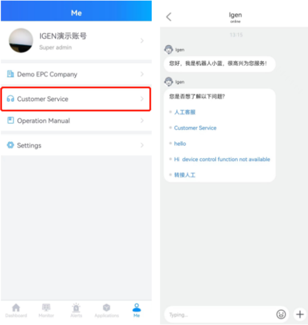 When you have problems in the use of the APP application, you can click【Customer Service】to jump to the chat interface. You can select manual customer service or intelligent customer service to reply. Please note that the online time of the manual customer service is: 09:00 a.m. - 11:30 a.m., 12:30 p.m. - 18:00 p.m. If the customer service is not online, you can leave a message directly, and the customer service will reply to you as soon as it is online. As shown in the figure: