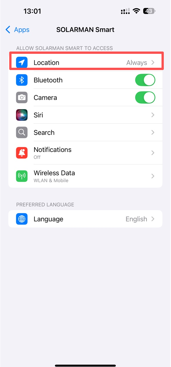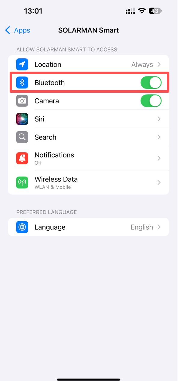 Solution: Enable Bluetooth authorization for the SOLARMAN app in your phone's settings