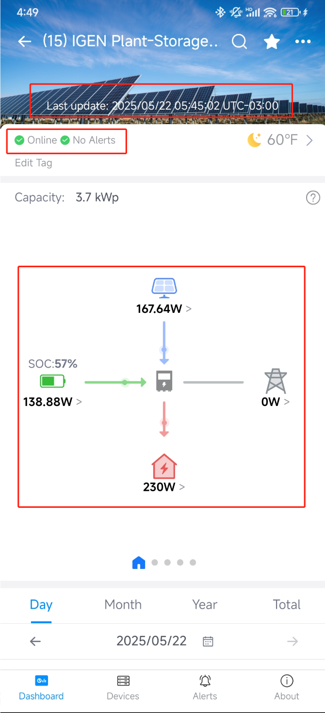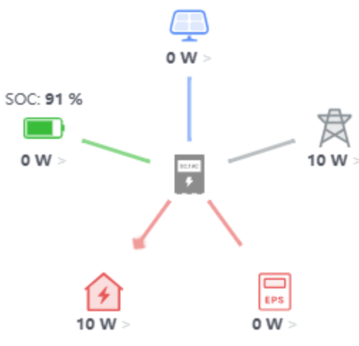 The power data, flow status, SOC within the flow map, communication status, alarm status and last update time will be pushed in a change-as-you-go mode, so that users can see the latest data without refreshing the interface, and the latest data can be seen within 60s after the device uploads the data (the device uploads the data once every 5 minutes).