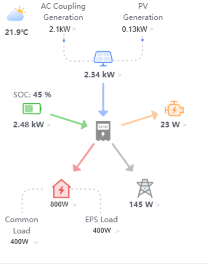 1) The flow diagram supports 2 levels of data display, such as 1 level for PV generation, 2 levels for AC coupling generation and PV generation, 1 level for consumption, and 2 levels for common loads and EPS loads
