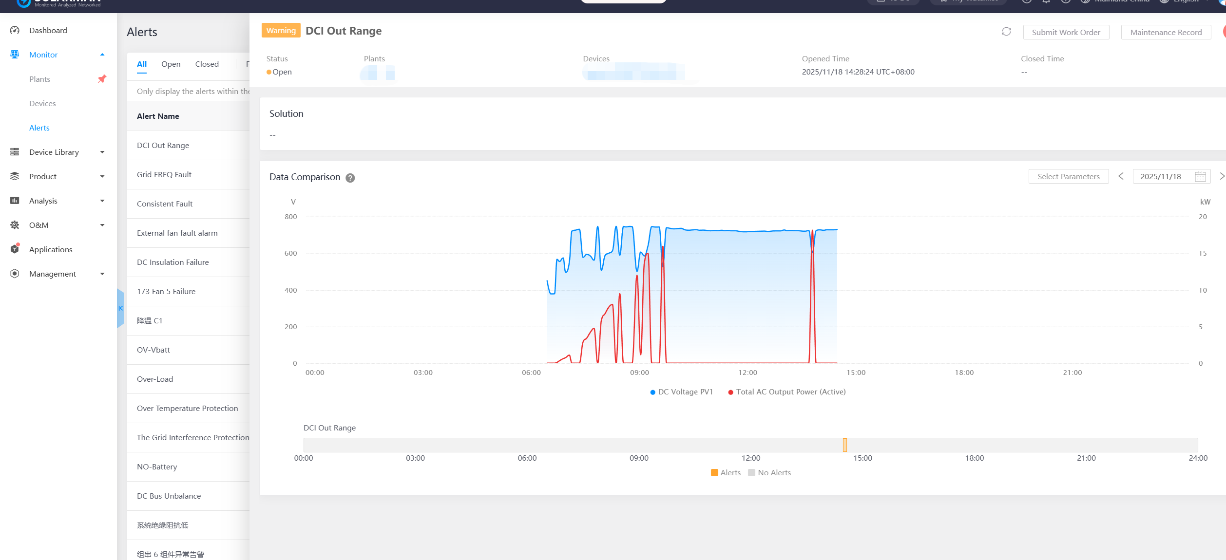 The last data frame before the device went offline uploaded an alarm, and the plant alarm icon will disappear 24 hours after it goes offline.