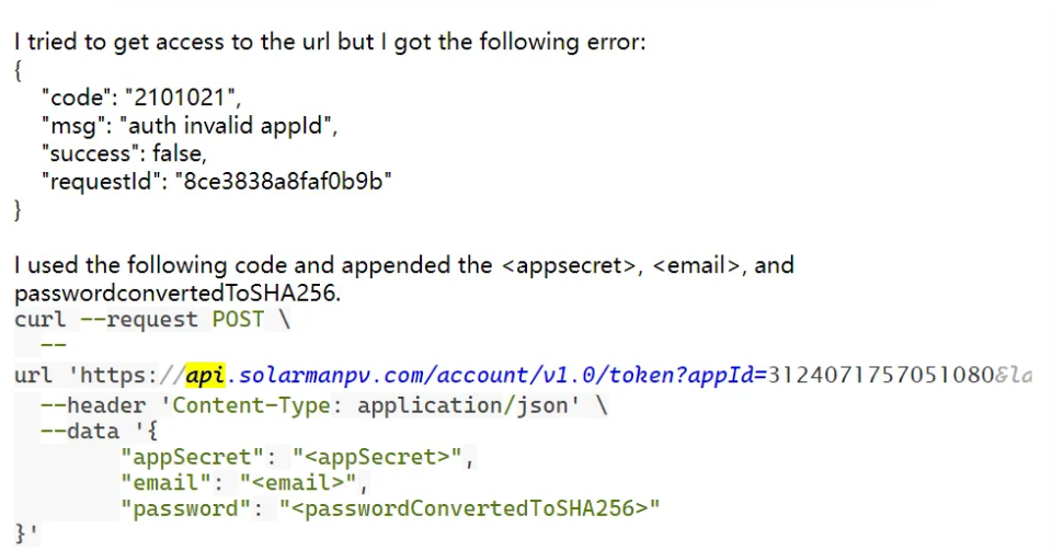 Unable to call API, showing auth invalid appId resolution【SOLARMAN Smart and Business】
