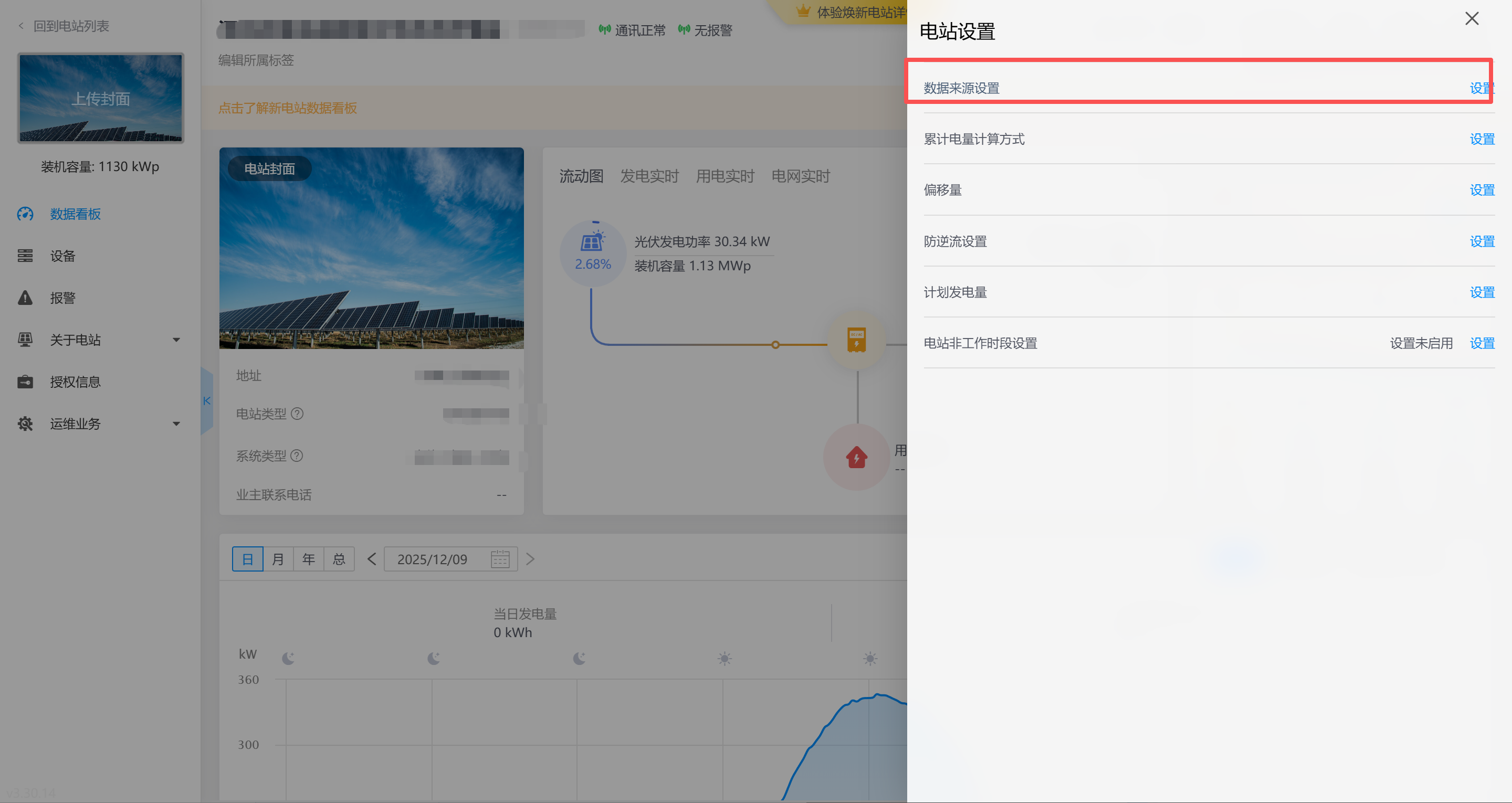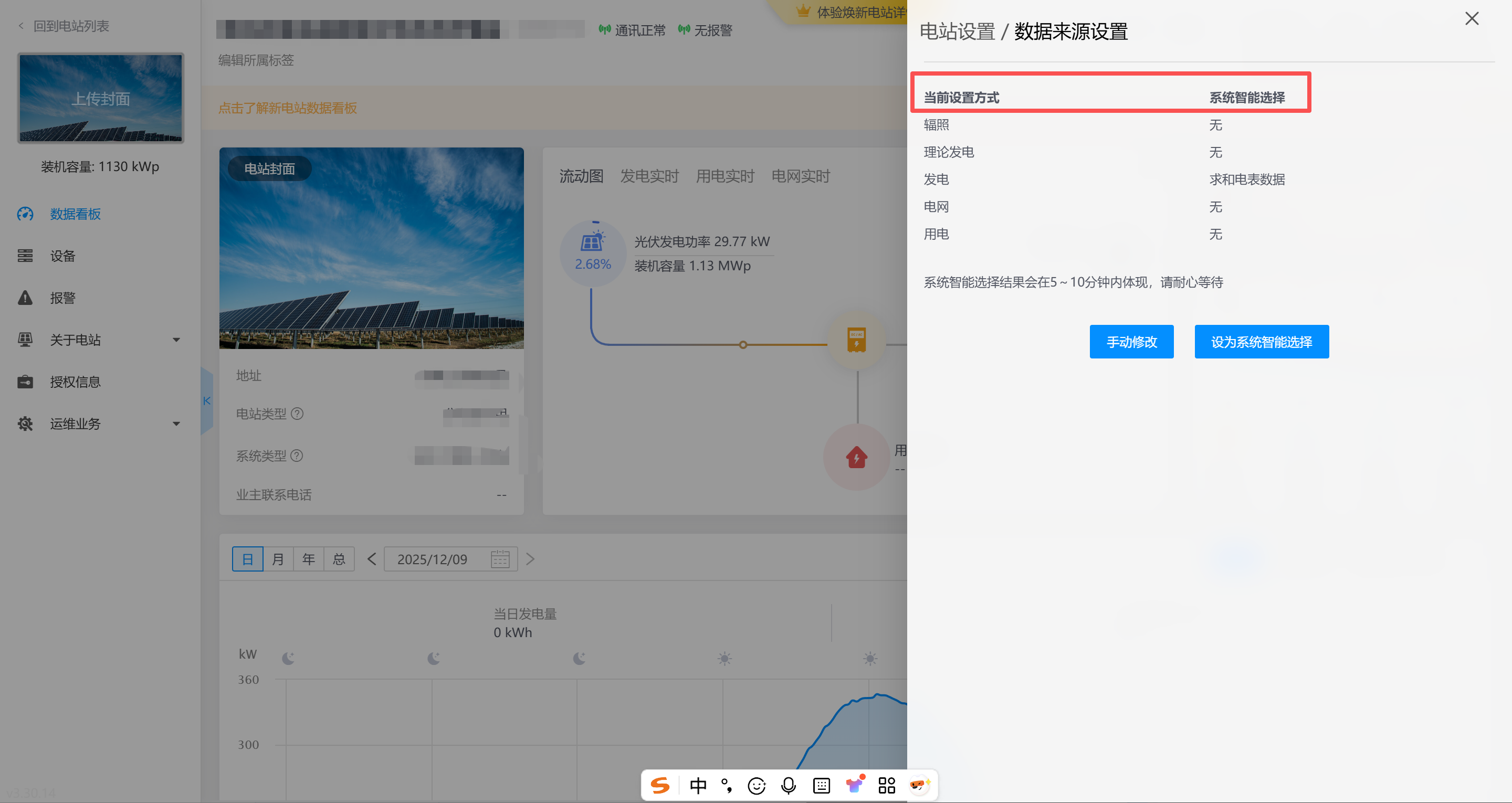 如您是电站创建者,请检查数据来源设置是否设置为智能选择,如果已经是智能选择,代表逆变器未上传电池数据。