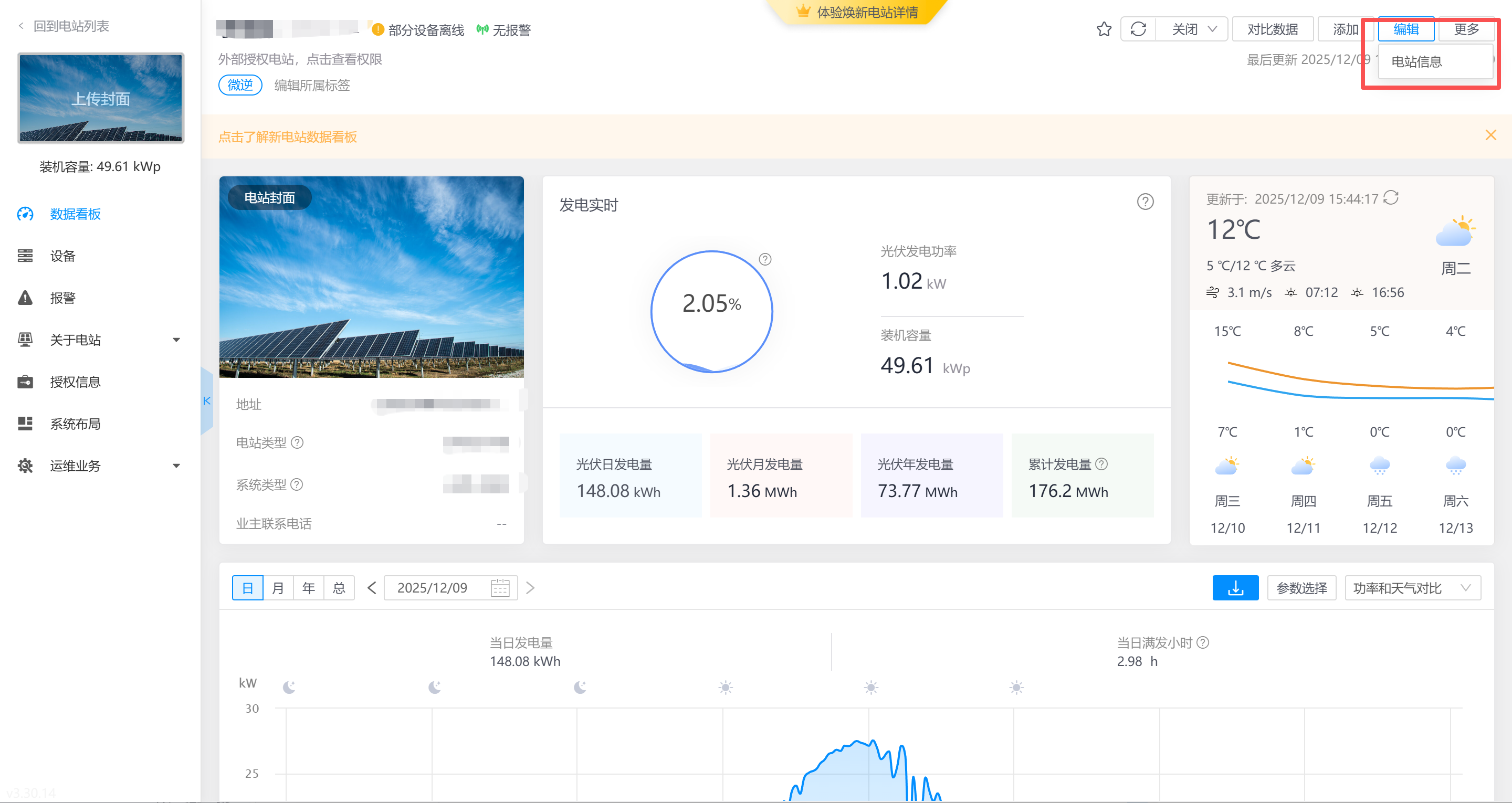 当系统类型为“光伏+电网+用电+储能”时,新电站数据看板将不再限制要展示哪些参数,默认所有数据都是空的,系统将根据设备上传数据的实际情况展示应该展示的参数