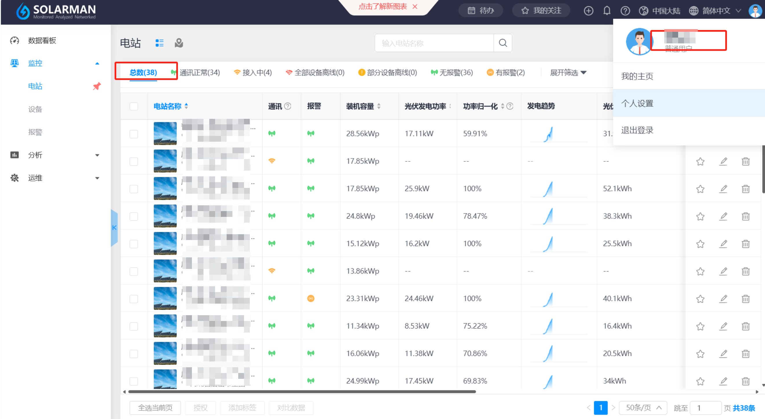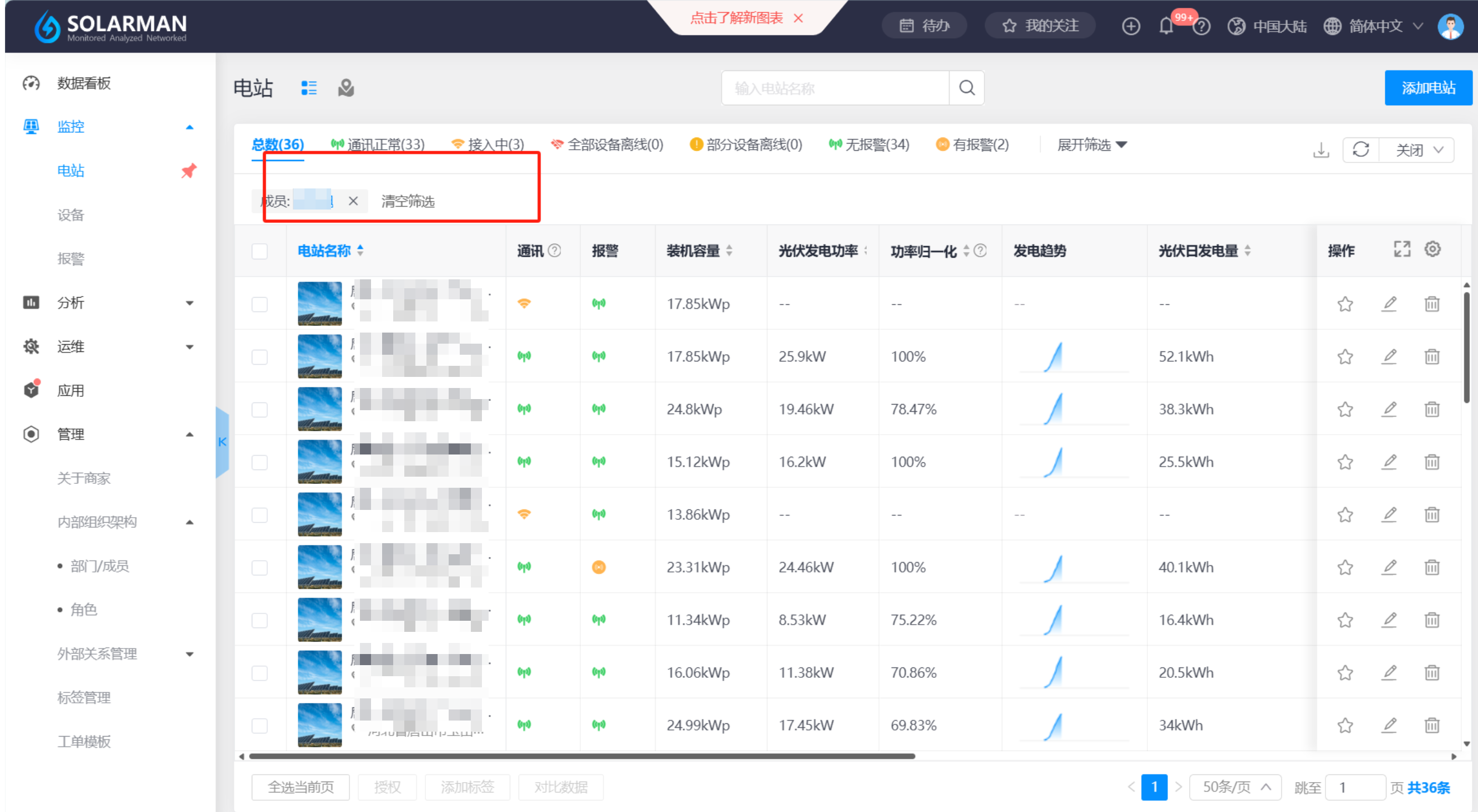 当电站授权给了商家的某个内部成员后,电站就会自动绑定到组织架构树上,即便解除了这个电站和成员的关系也无法改变电站已和组织架构绑定的事实,因此该员工可查看到的电站为38个(其中两个为所在部门所查看的电站)处理建议:建议把该成员的权限改为“本人的电站”,这样就会少看到曾经两个授权给该部门成员的电站,电站数量也会和筛选的数量保持一致。