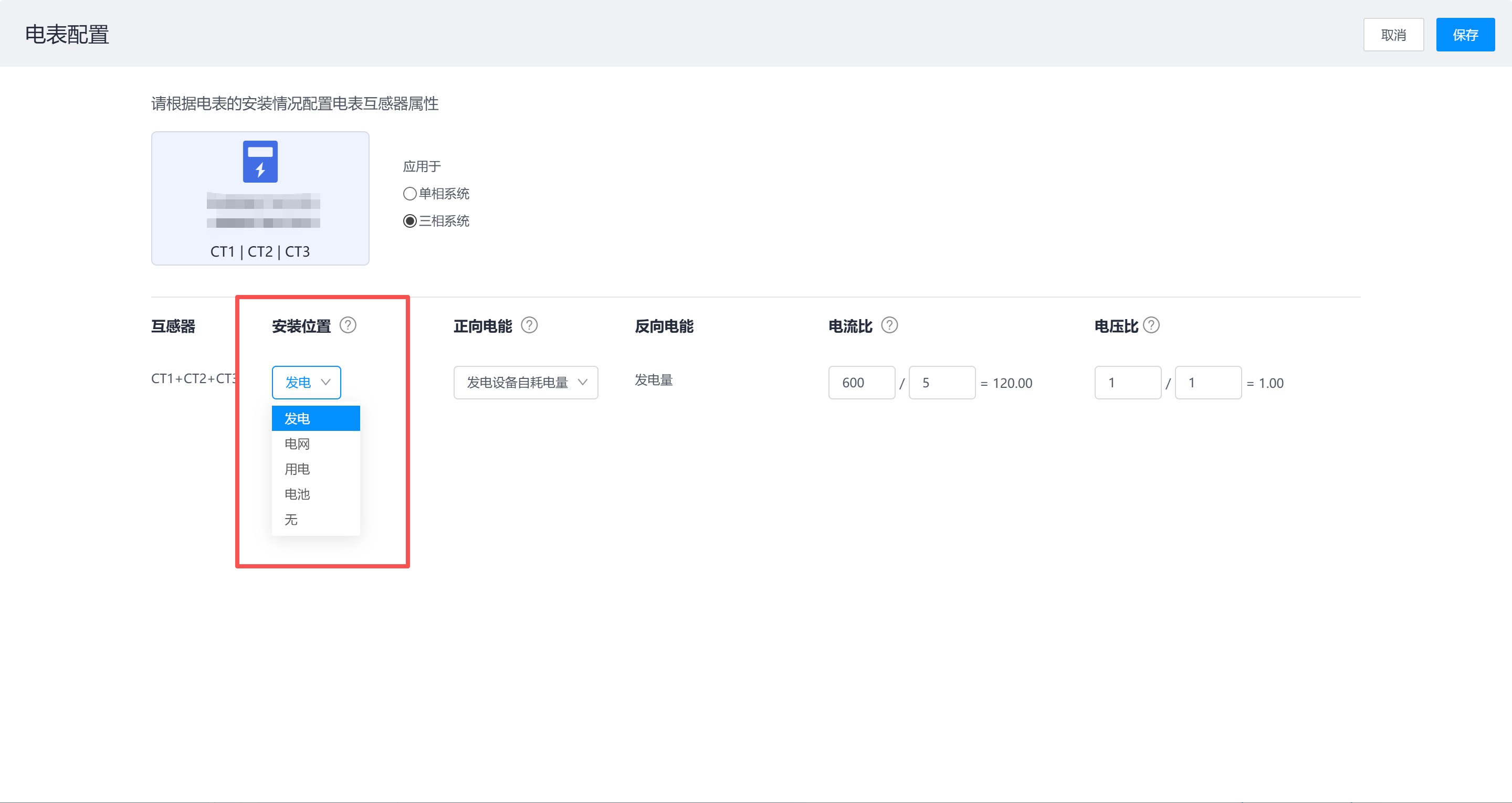 请确认您的电表安装位置,如您的电表为关口表,安装位置则选择电网 ;如您的电表为并网柜电表,则安装位置选择发电。电流比可参考电表互感器信息进行填写,电压比如非高压项目则不涉及到。