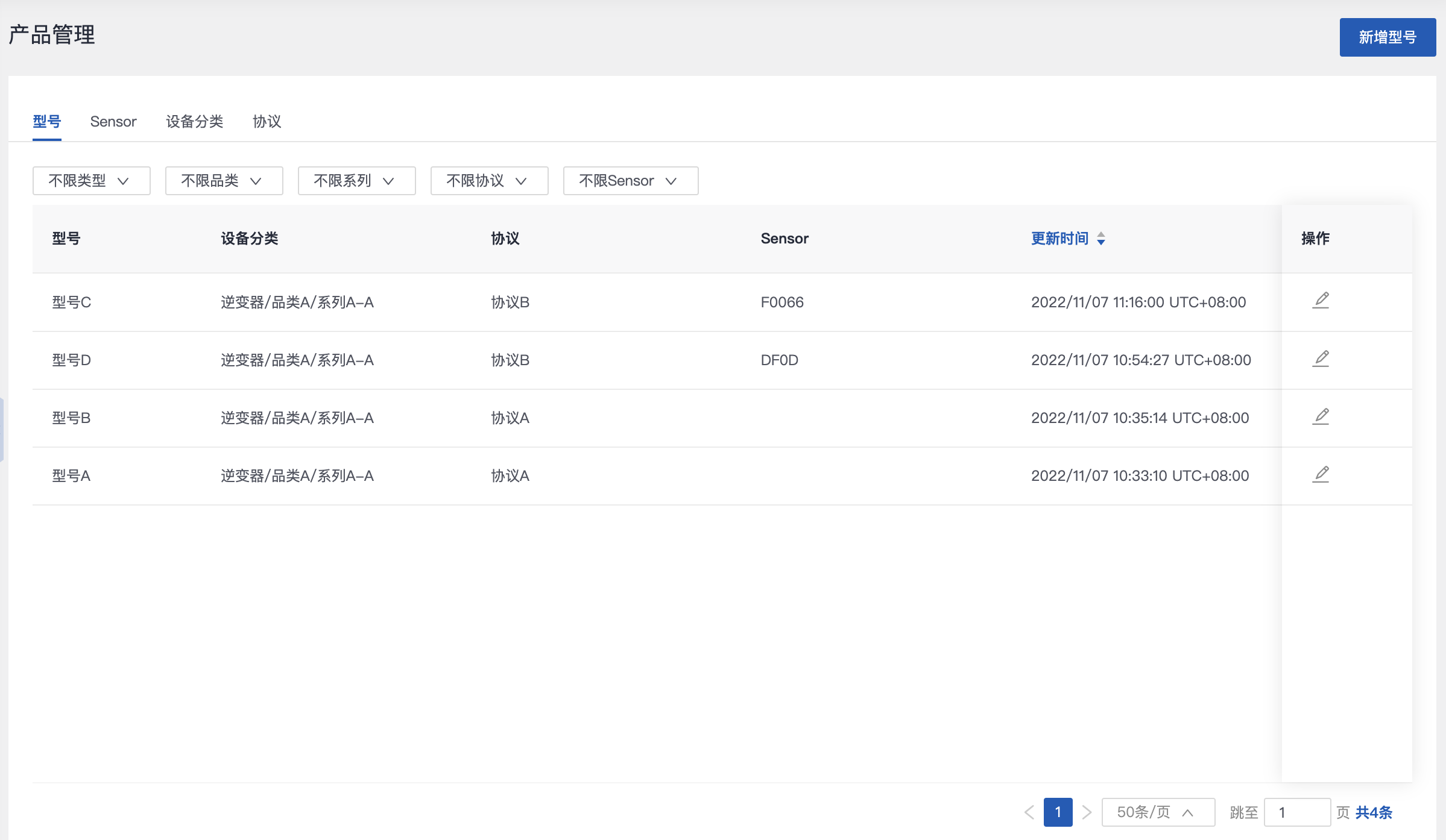 通过管理设备的协议,设备的分类,设备的型号以及与SOLARMAN共同维护Sensor。相比传统的产品管理更精细。