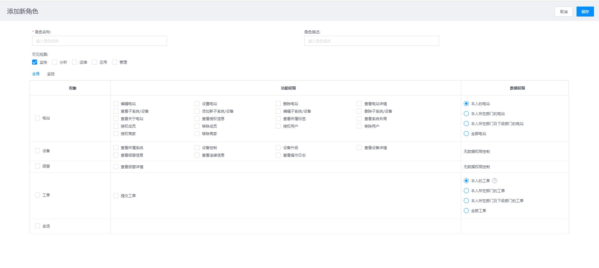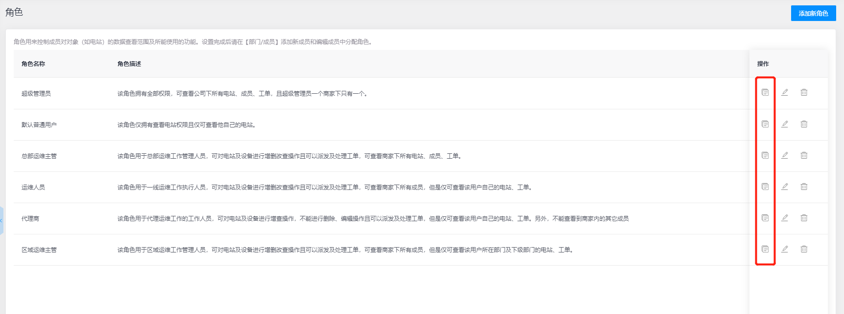 查看角色:可在角色列表下选择对应的角色数据信息,然后点击操作栏【查看】按钮,可跳转对应页面,查看详细信息或修改新角色的功能权限配置,注意系统预设角色只能查看没有修改权限