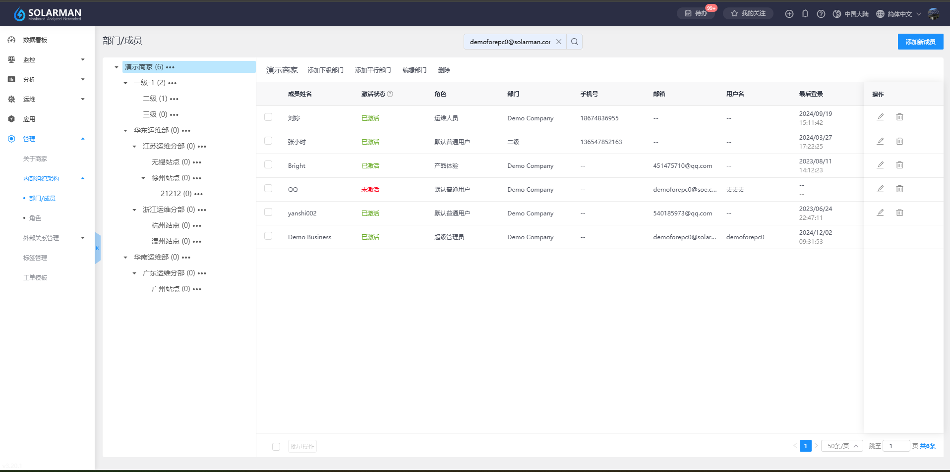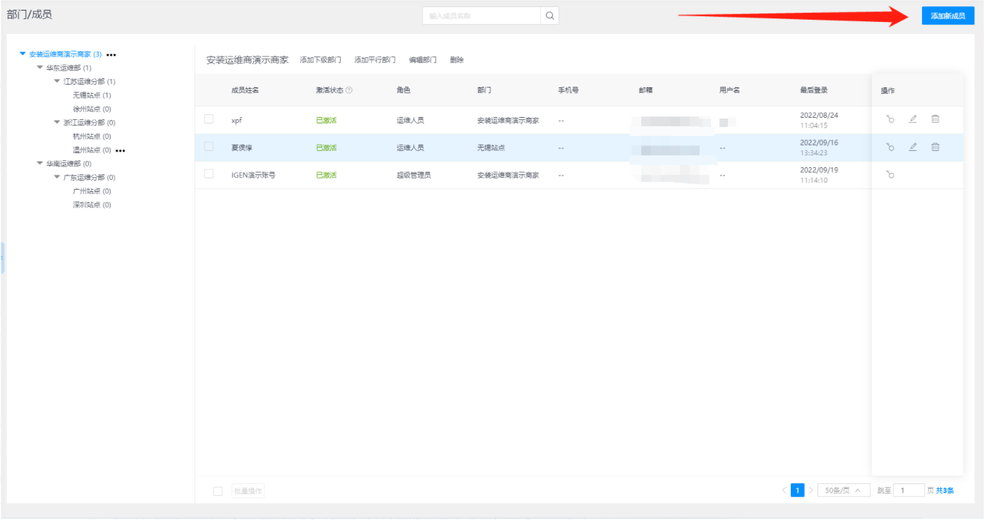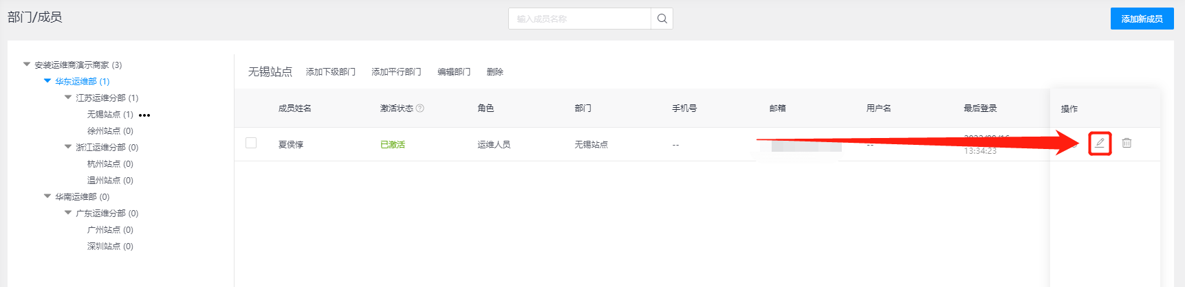 编辑成员:可在所属组织下找到对应的内部成员数据信息,选择操作栏【编辑】按钮可对该成员的账号信息进行修改维护