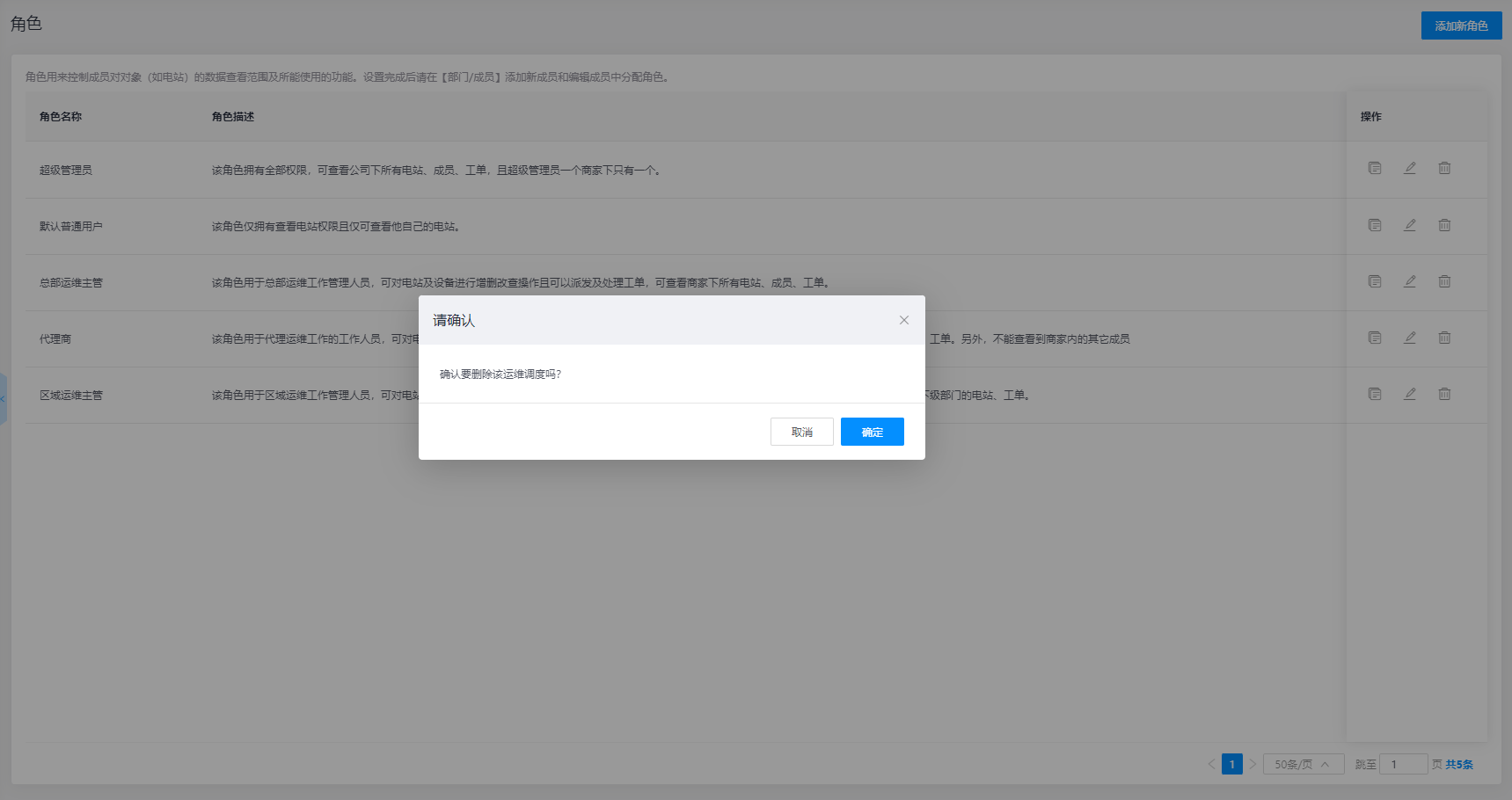 删除角色:如果想要删除角色,可在角色列表下选择对应的角色数据信息,然后点击操作栏【删除】按钮,页面显示提示弹窗,需要您确认后完成对应角色删除操作,由于角色会关联多个账号请谨慎操作!