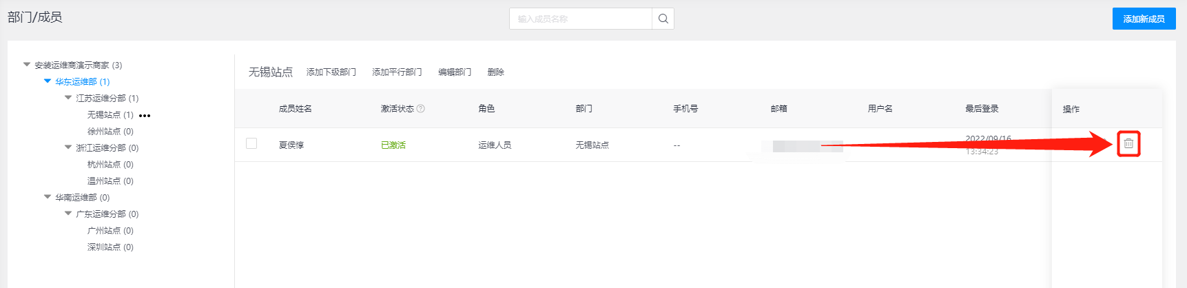 删除成员:可在所属组织下找到对应的内部成员数据信息,选择操作栏【删除】按钮可对该成员的账号数据进行删除,主要用于部门离职人员或错误操作场景