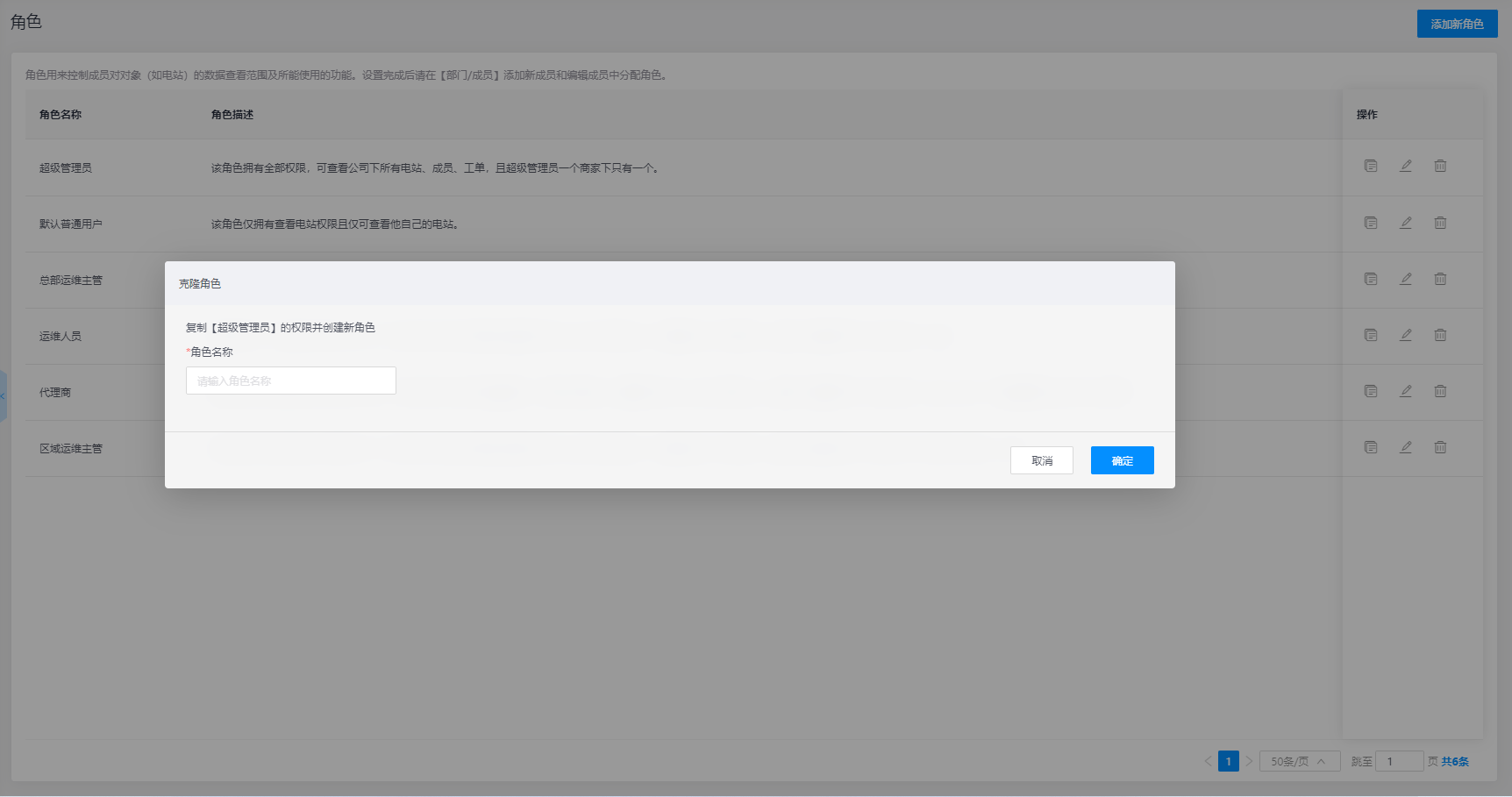 克隆角色:可在角色列表下选择对应的角色信息,然后点击操作栏【克隆】按钮,显示对应弹窗,在窗口中修改角色名称后可对该角色的功能权限进行克隆操作