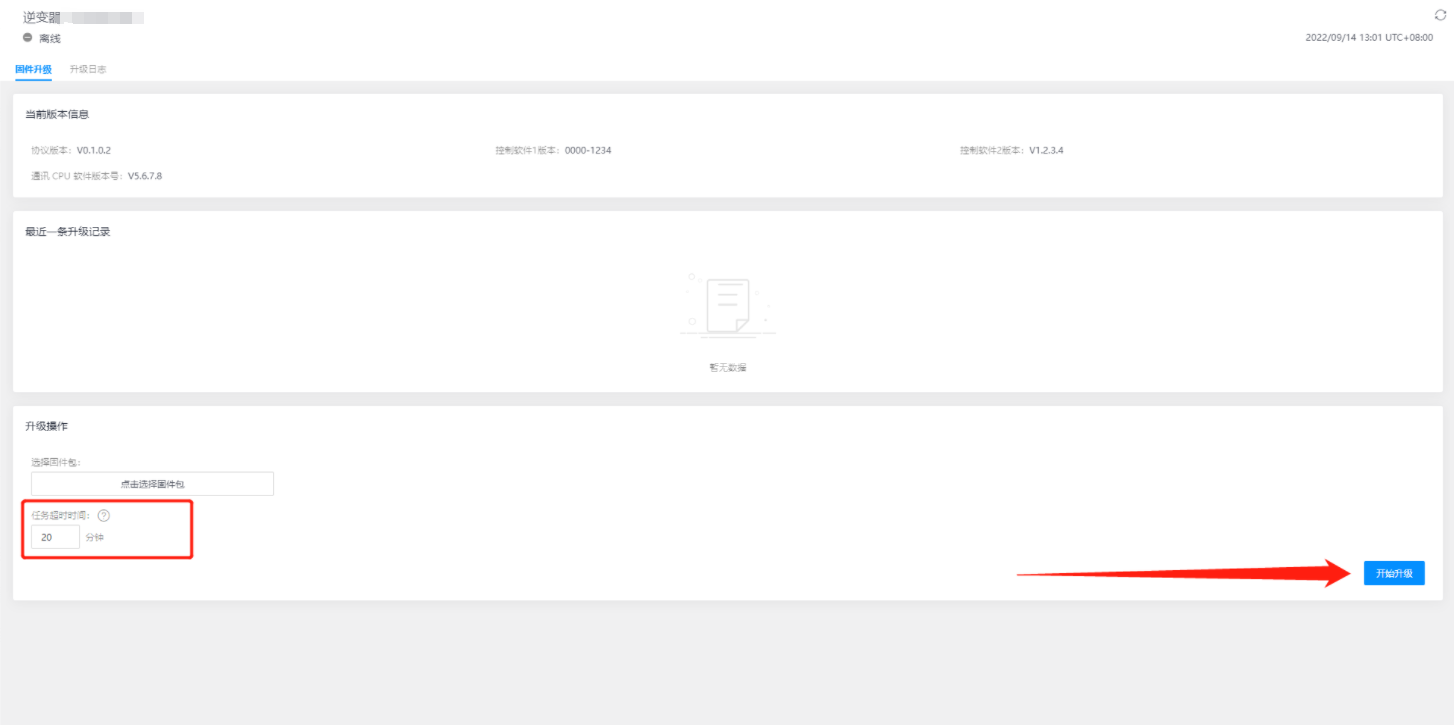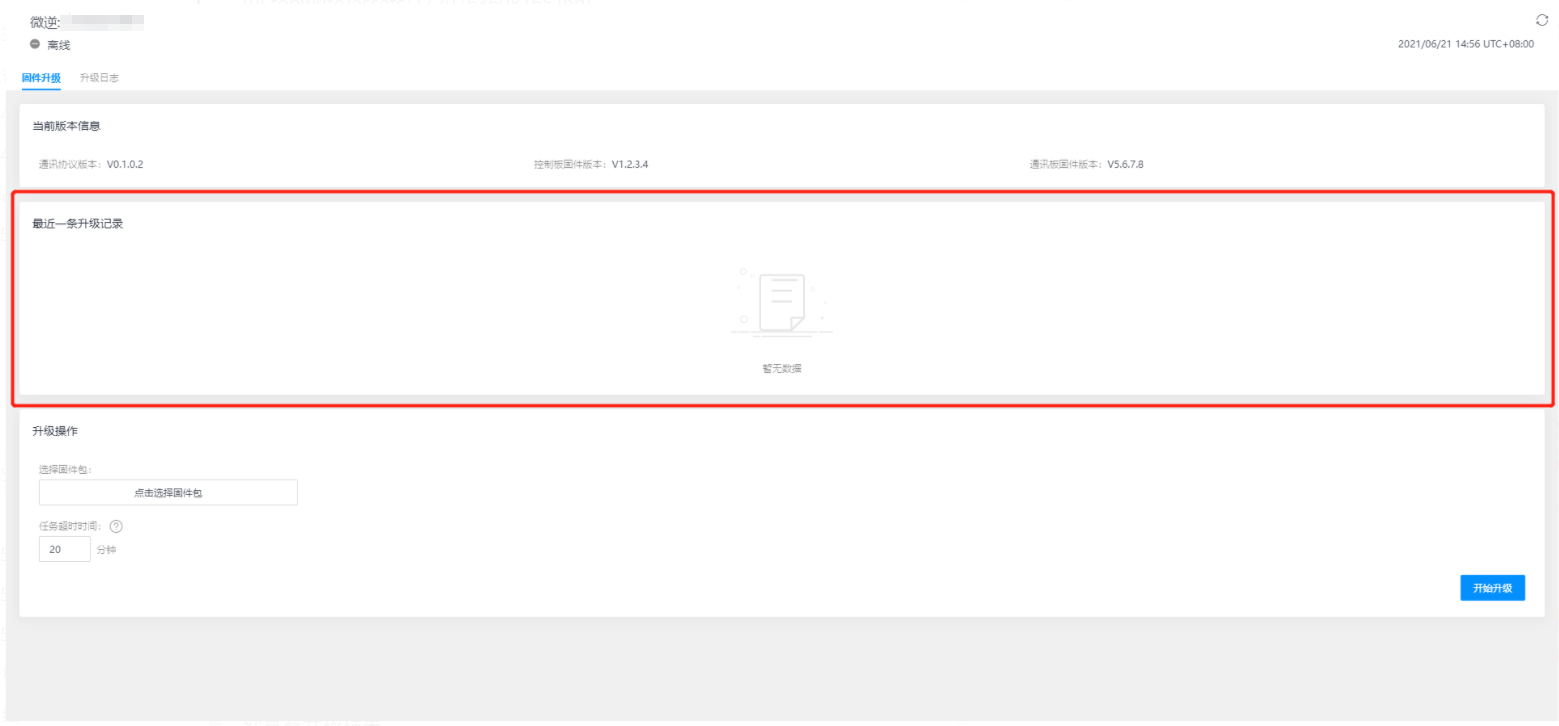 - 单个设备升级请您点击进入目标设备的设备详情页面,点击下图所示按钮进行单个设备升级,然后请您选择目标设备升级所用的固件包请您设置设备升级的超时时间,并点击“固件升级”按钮开始升级注:“超时时间”为本次升级任务的最长时间,在超时时间内,若设备升级成功,则任务提前结束。若到达超时时间后,设备没有升级成功,则升级任务自动结束,升级结果判定为失败。确认升级结果:若平台检测到 选择升级的版本号(如“DSP版本号”)发生了改变,则自动判定为升级成功,否则判定为升级失败。