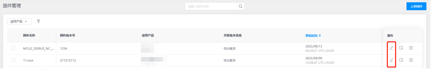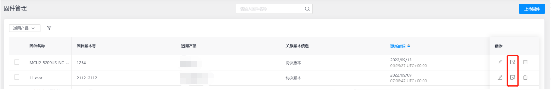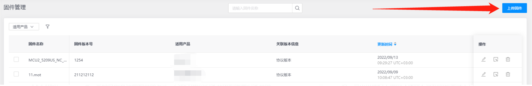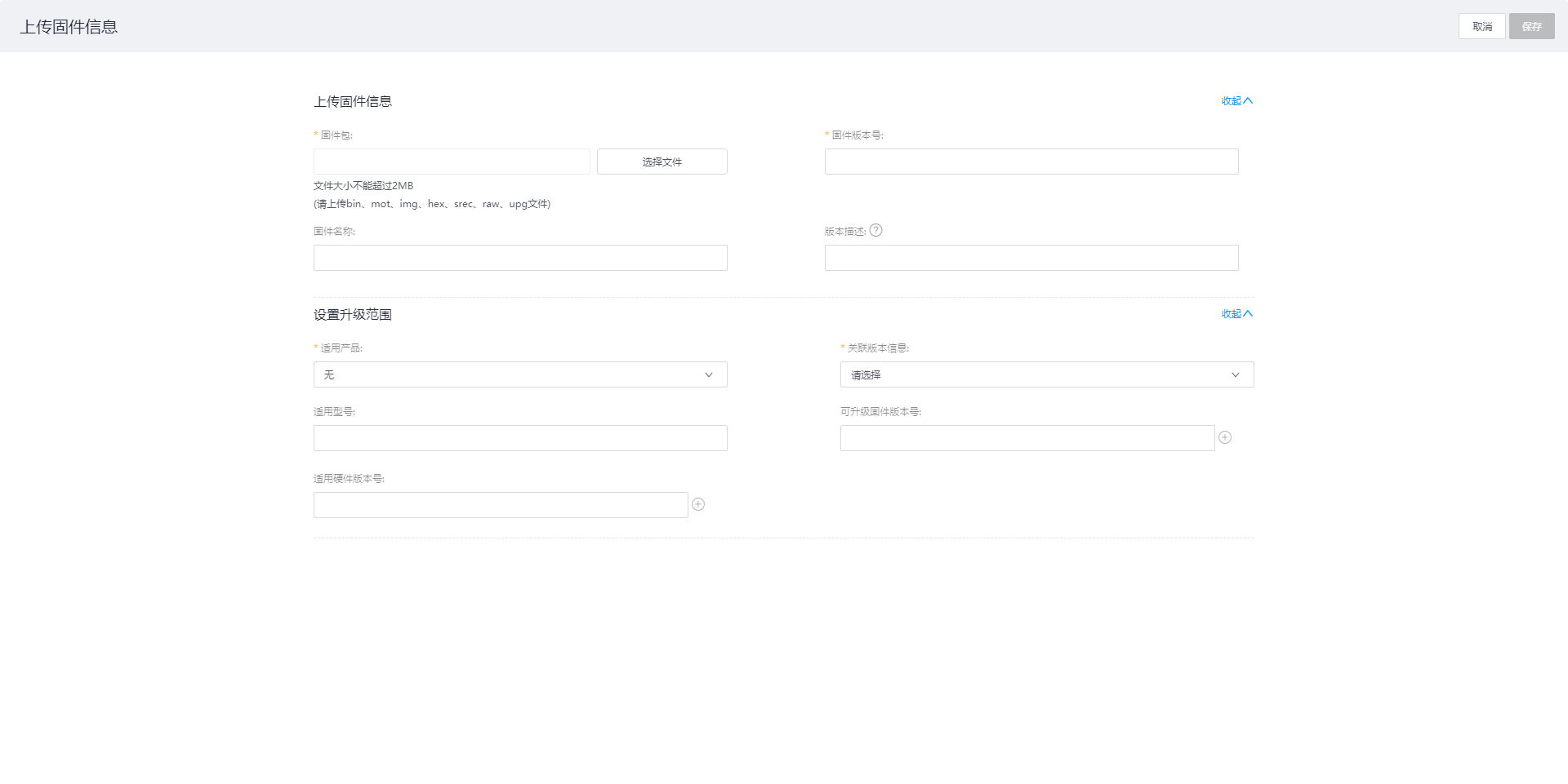 - 上传固件: 当您需要上传新的固件信息时,可点击右上角的【上传固件】按钮,跳转对应的上传固件页面,请根据提示完成添加操作,如图所示:注:在上传固件操作前,您需要有已完成添加的产品,否则无法进行产品选择和上传