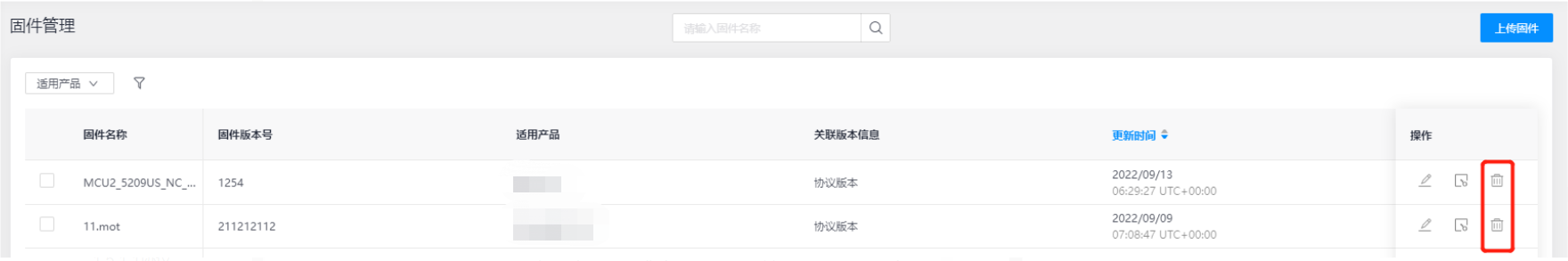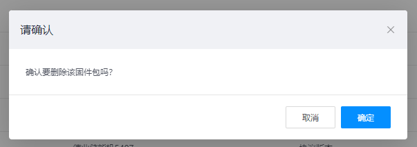 - 删除: 在数据列表当中已完成上传的固件数据操作栏显示【删除】,点击【删除】按钮,页面显示提示弹窗,请根据需求确认是否删除该固件包,点击确认即可完成删除操作,如图所示: