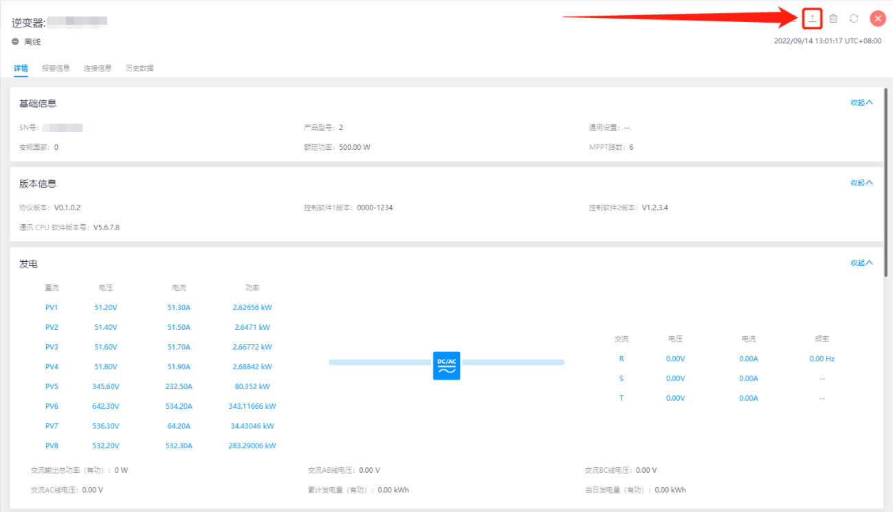 - 升级进度说明若您的逆变器使用的采集器支持上传升级进度,则您在固件升级任务开始后,可以查看到设备的升级进度。选择点击逆变器所关联的采集器SN,并打开采集器的详情页面,若实时信息中包含“支持升级进度上报”参数,且对应的值显示为“1”,则逆变器升级时可以看到升级进度条,若您的采集器不支持该功能,请联系平台升级您的采集器。固件升级任务的流程及进度的含义:当“采集器收到升级指令”时为25%,文件下载成功为50%,文件校验通过为75%。版本号变化或逆变器交互成功为100%,100%默认为“升级成功”