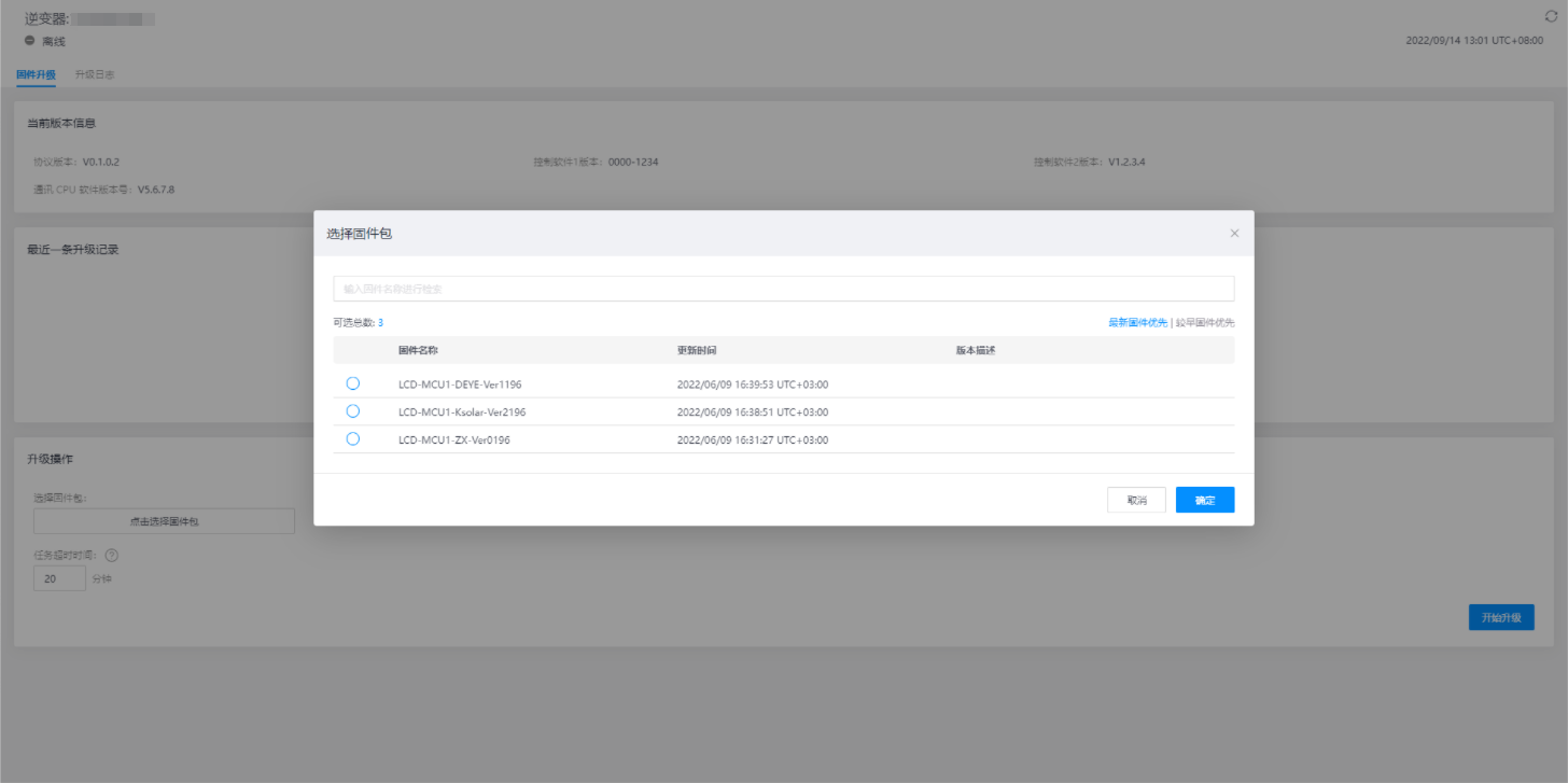 - 上传固件时,固件包本身的版本 跟实际关联的要升级的版本不一致。例如固件包本身是“DSP版本”的固件,但是上传固件包时关联了“通讯协议版本”,将会导致升级前后“DSP版本”没有发生变化,任务显示升级失败