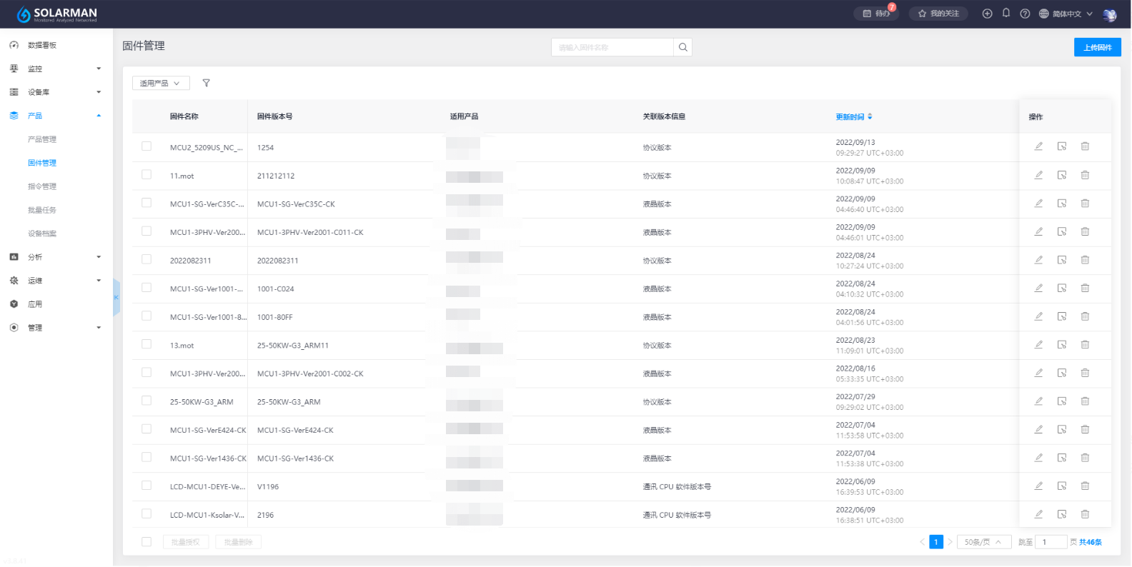 【固件管理】模块是电站设备中的固件信息数据进行汇总管理,可通过固件列表查看固件信息,支持上传和编辑、授权、删除固件信息,以及完成对应的的固件升级操作,方便您在该模块对固件数据操作与使用。